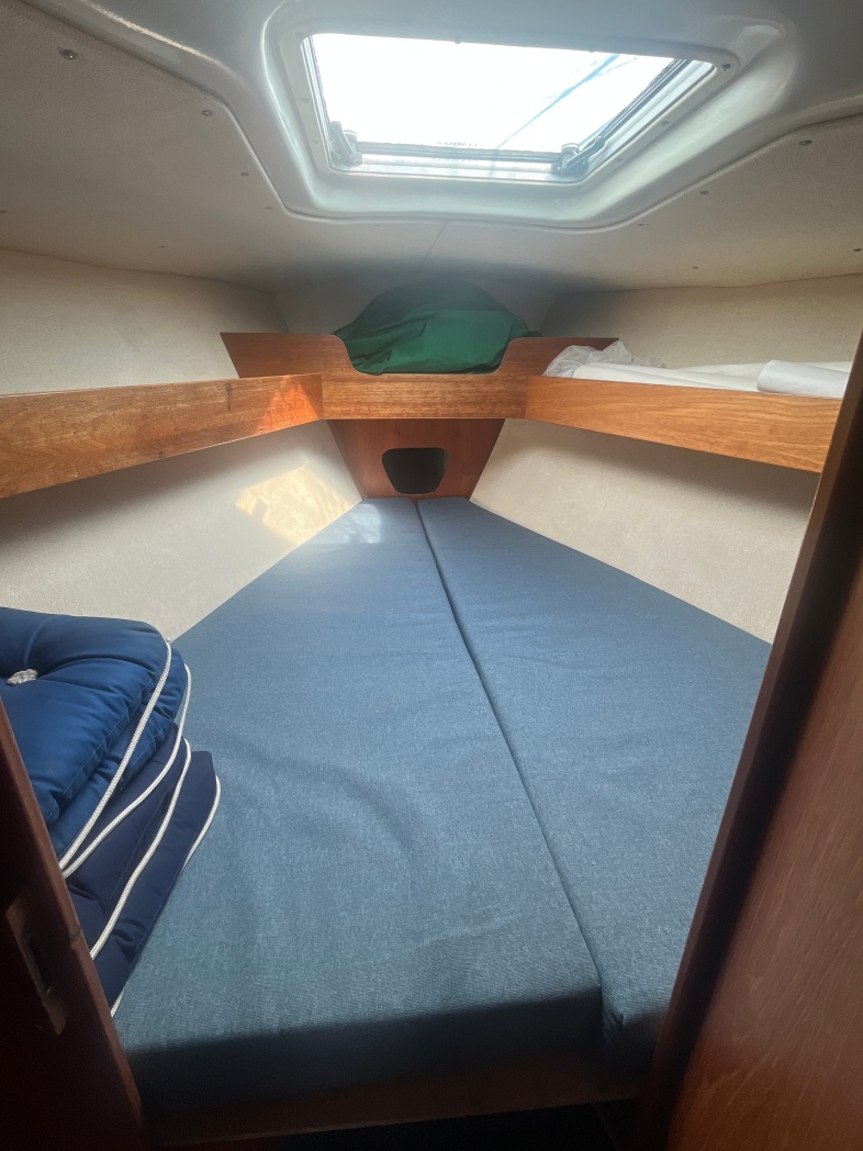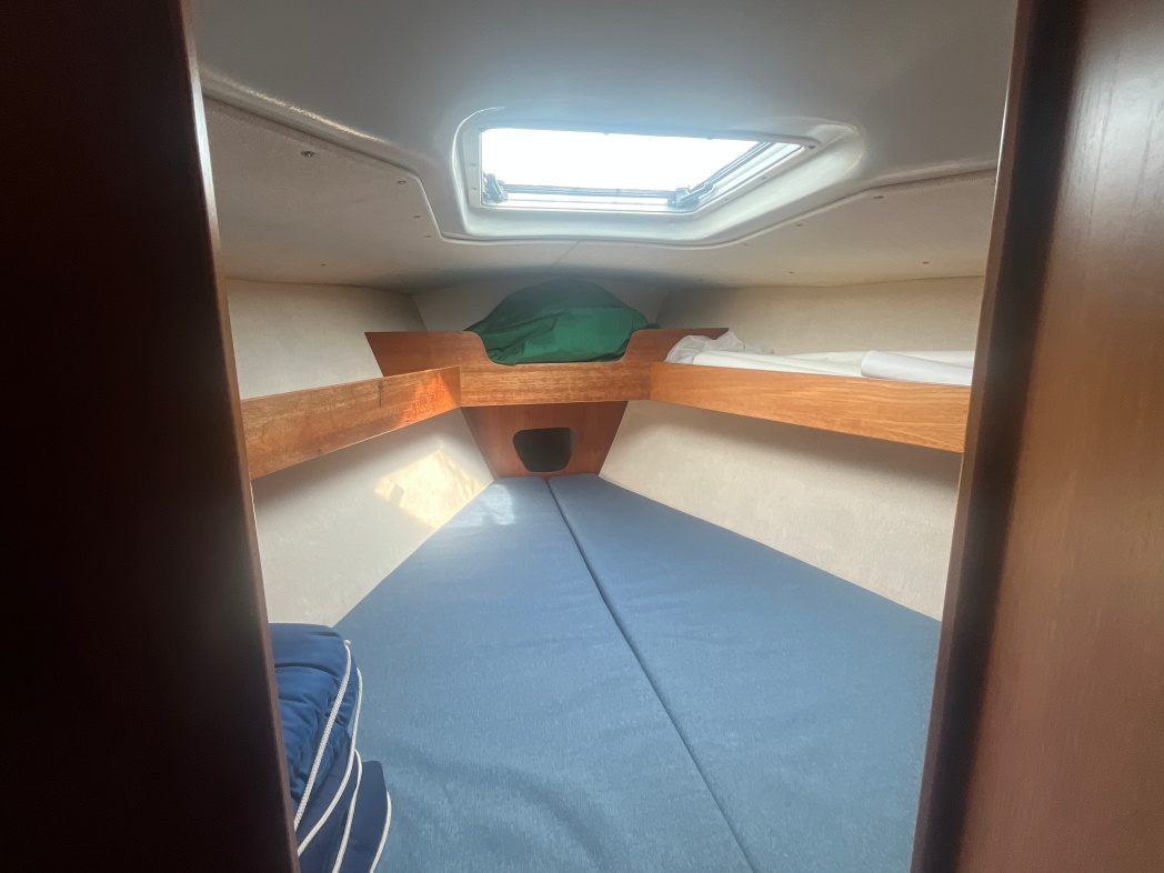 Under dæk er båden indrettet med god plads til 5 fine køjepladser. Disponeret med stor stikkøje - salon med sofagruppe/m.bord og pantry. Mellemgang der fører ud til toilet i STB-side (aflukket) og 2 køjepladser i stævn.