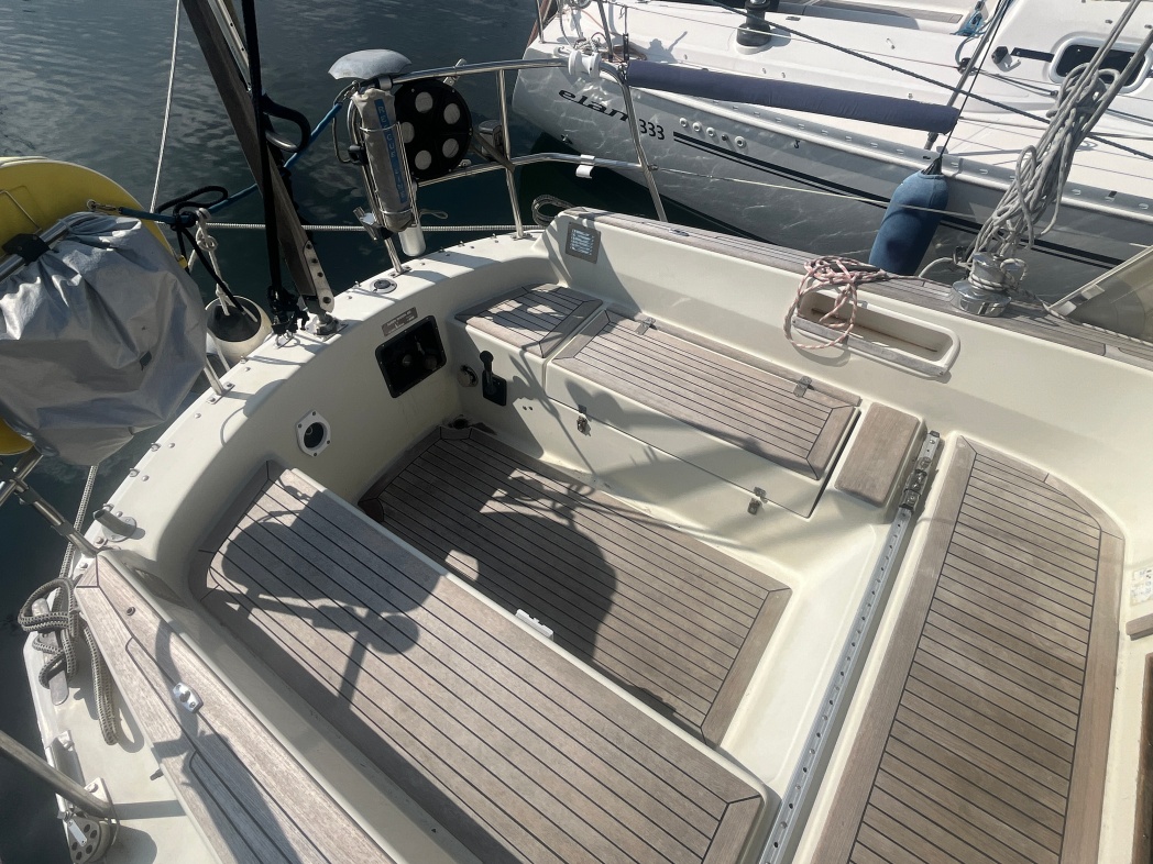 Udvendigt imponerende stort cockpit, praktisk indrettet og med tilhørende sprayhood og kaleche. Masser af dæksplads, der både øger sikkerhed og komfort, når man færdes på dæk, og samtidig også et godt spot, når der skal solbades.