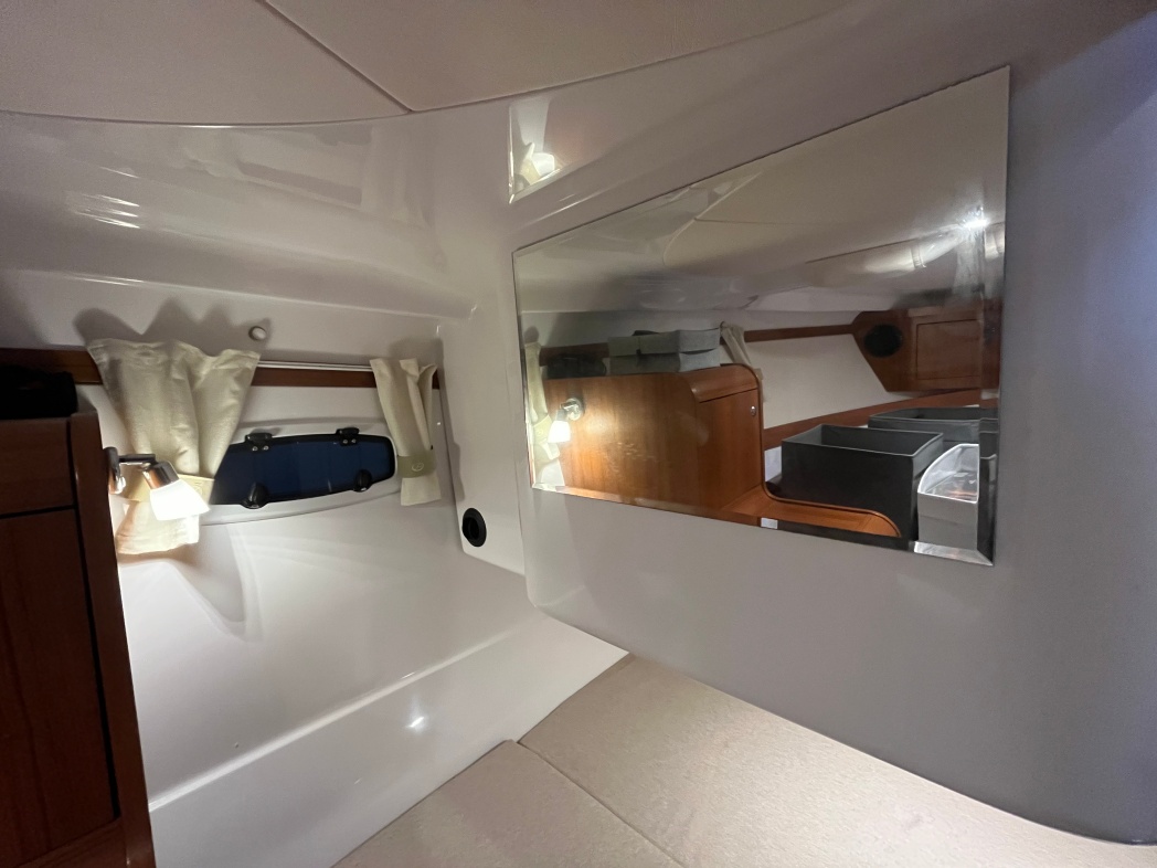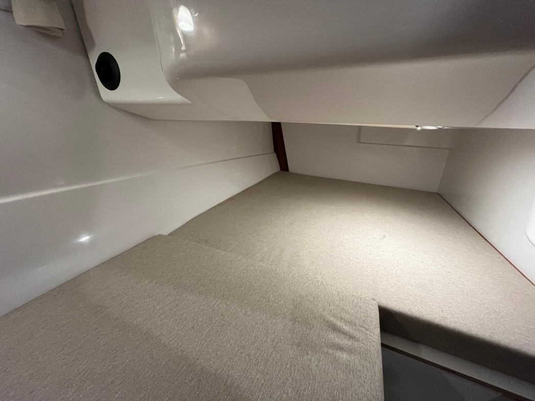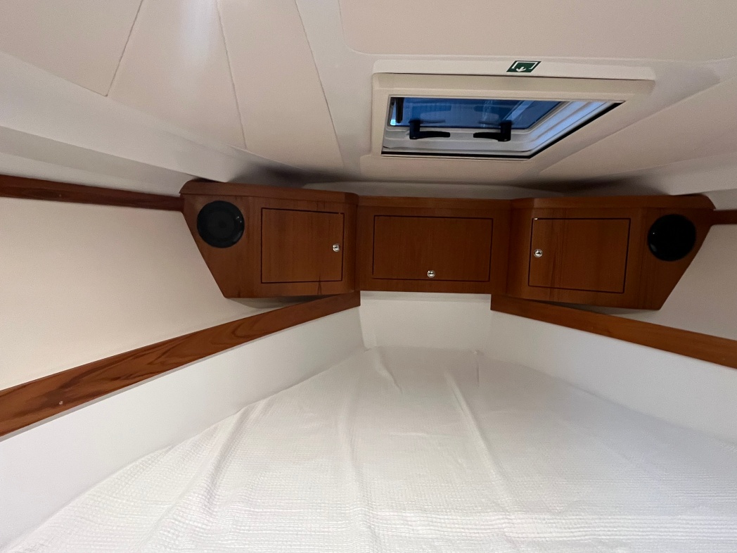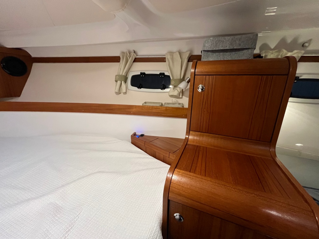 Kahytten på Aquador 28 HT er også imponerende med sin rummelige og luksuriøse design. Der er plads til 4 overnattende (stor dobbeltseng i front og dobbelt stikkøje i STB-side). I kahyt forefindes seperat toilet og brusebad. Interiøret er smagfuldt med flot træaptering og højkvalitetstekstiler.