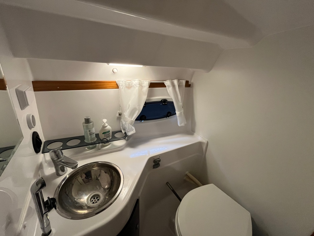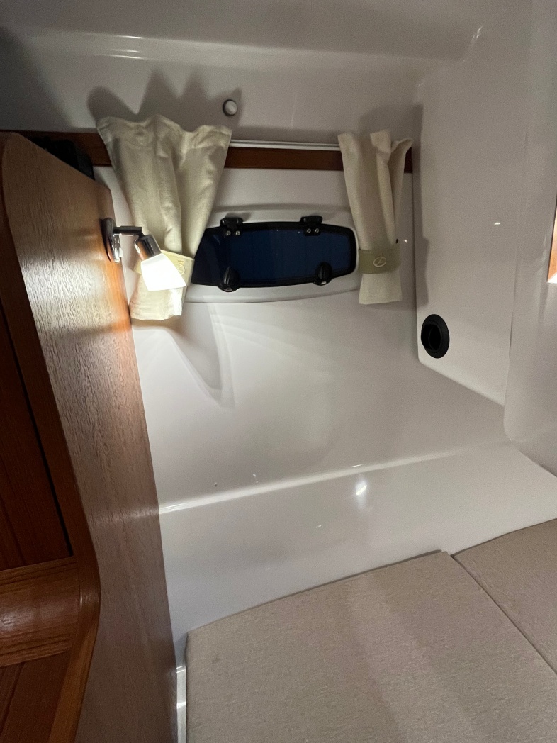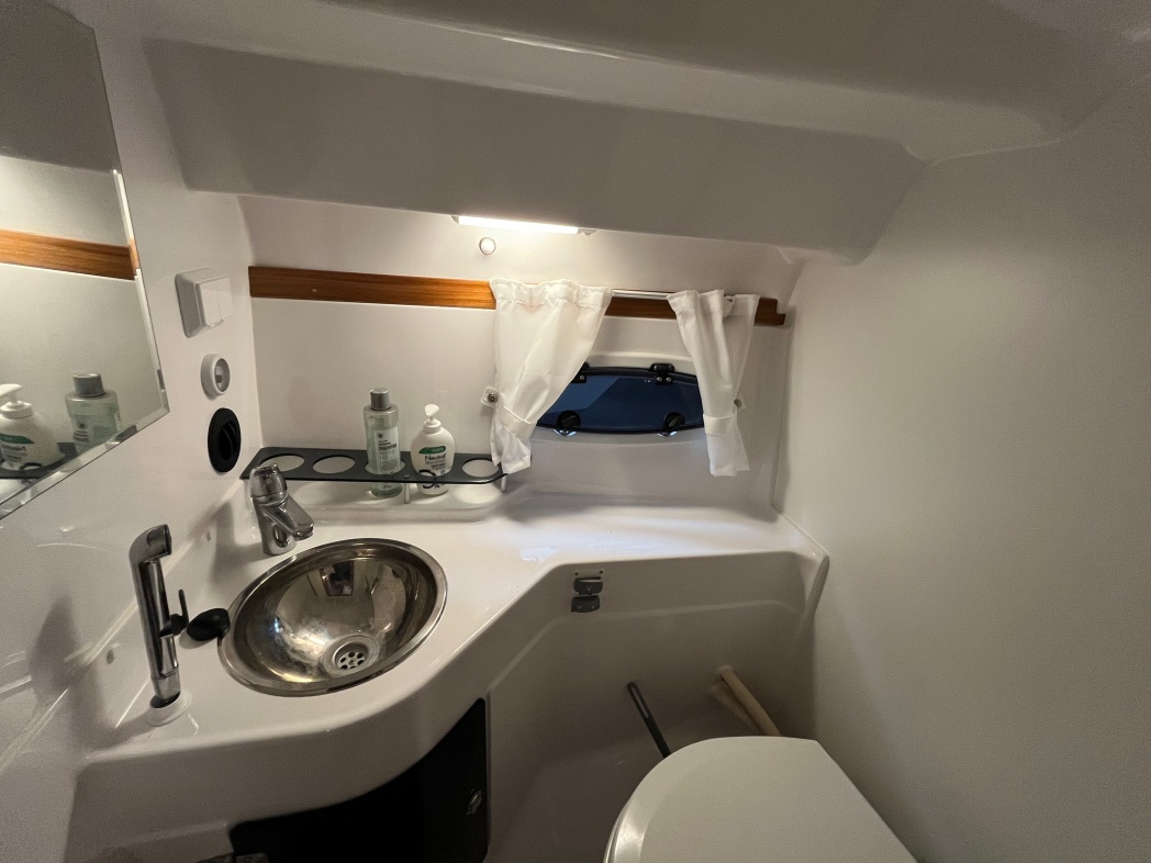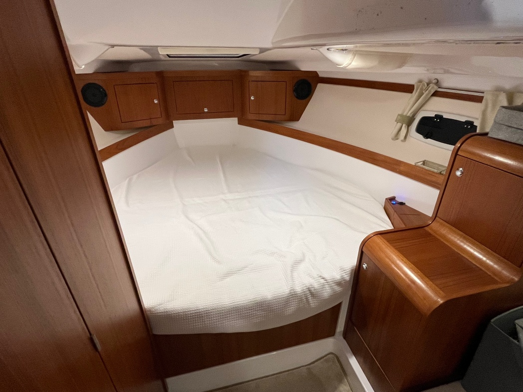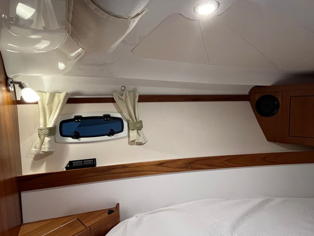 Kahytten på Aquador 28 HT er også imponerende med sin rummelige og luksuriøse design. Der er plads til 4 overnattende (stor dobbeltseng i front og dobbelt stikkøje i STB-side). I kahyt forefindes seperat toilet og brusebad. Interiøret er smagfuldt med flot træaptering og højkvalitetstekstiler.