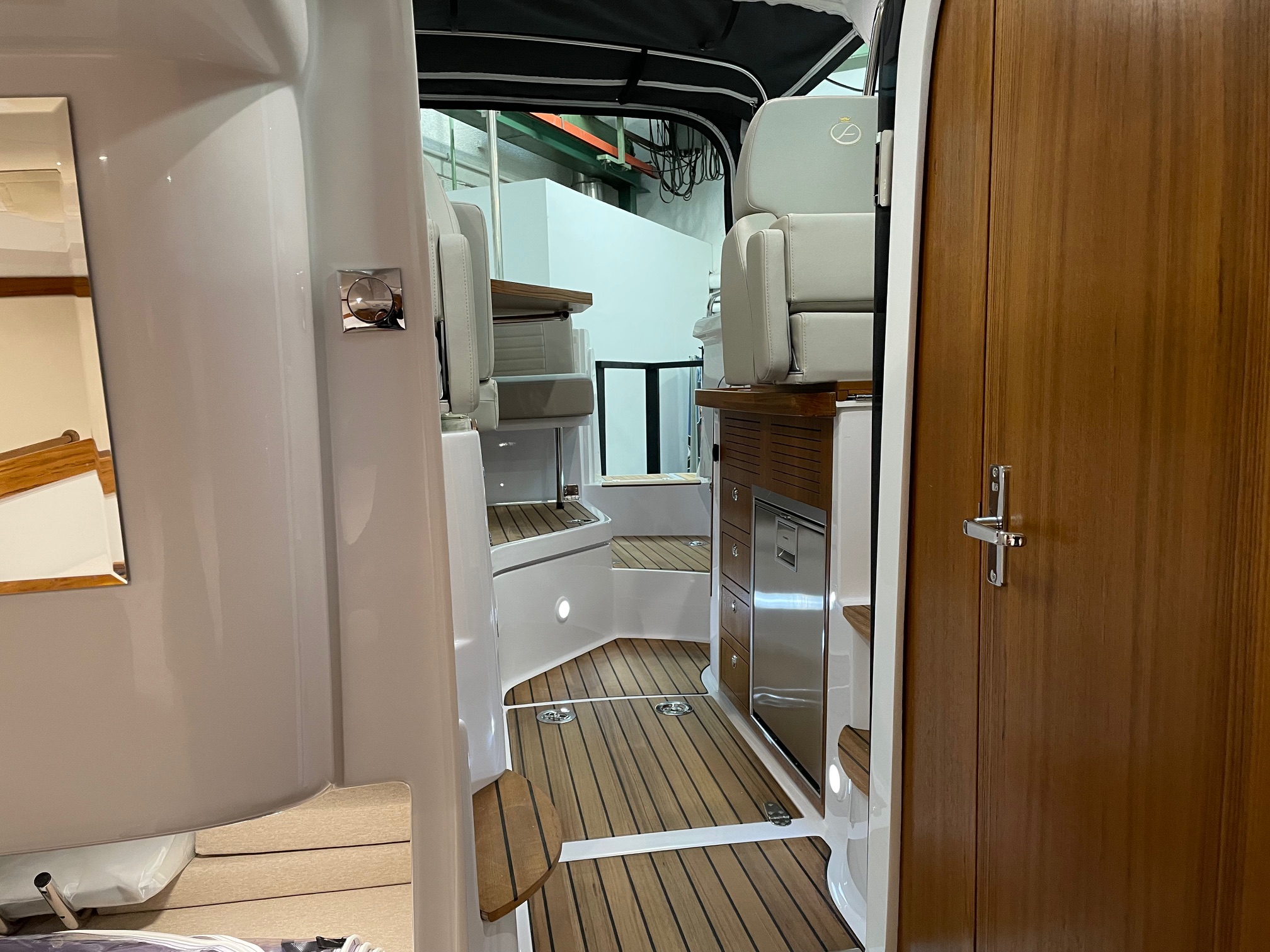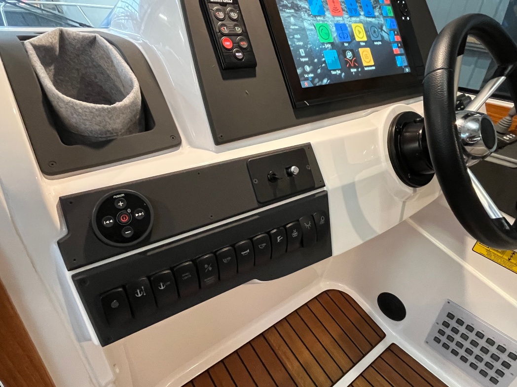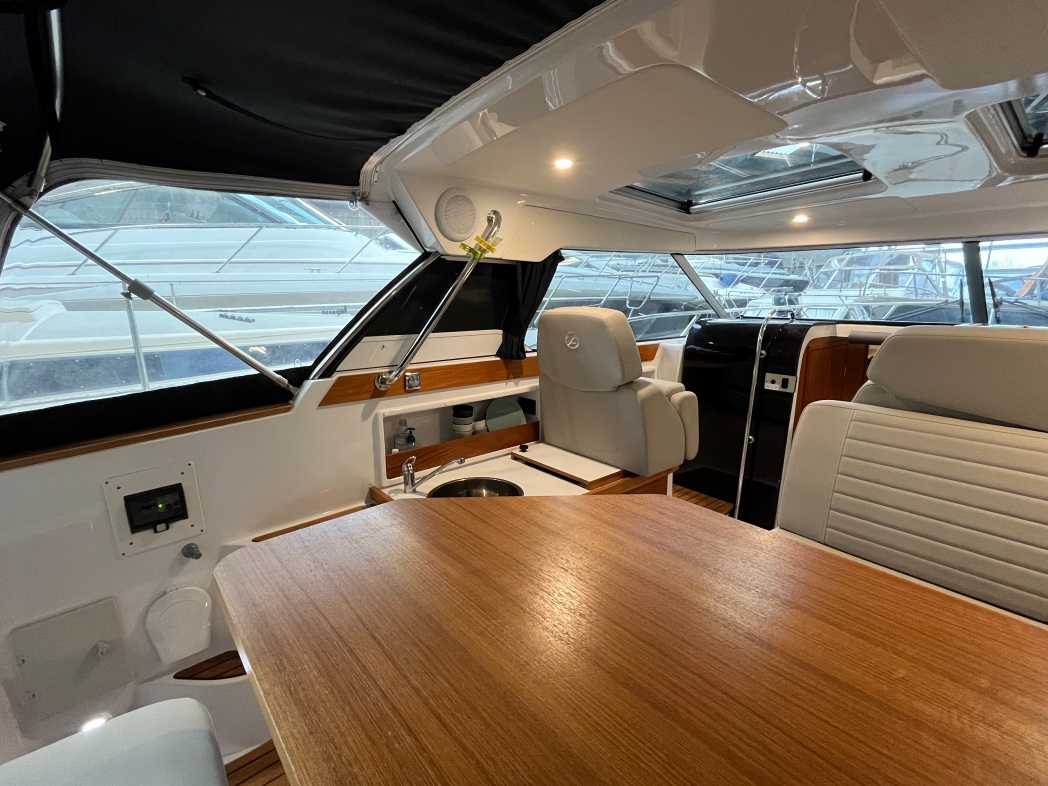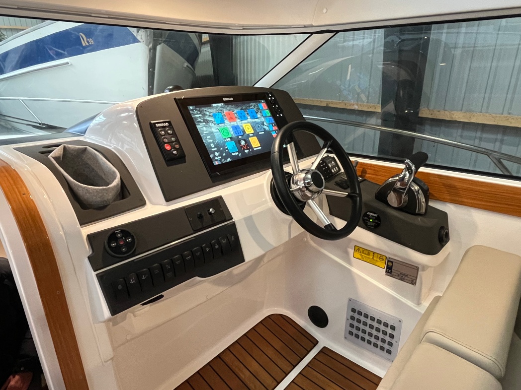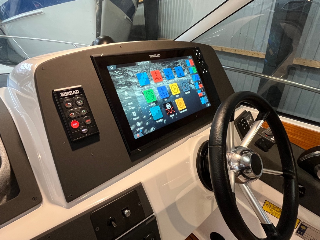Bådens cockpit er et stort og rummeligt, med stor sofagruppe med elektrisk hæve/sænke bord i den ene side, der nemt kan omdannes til solseng. I BB-side pantry med Wallas-blus, vask og køleskab med frys. I front af cockpit finder du styreplads og passagersæder. Herfra et godt udsyn, så sejladsen kan ske på sikker vis. I hardtoppen er der monteret 2 stk. skylights, der udover at give et dejligt lysindfald også kan skydes tilbage og herved åbnes helt. Den AQUADOR er udrustet med SIMRAD NSS EVO 16-3+ navigationssystem; En samlet smart løsning hvor, navigation, fishfinder, ekkolod, autopilot, musikanlæg og motor kan monitorers og styres, ved hjælp af enkle klik. Samlet pris inkl. autopiloten ca DKK 95.000,-