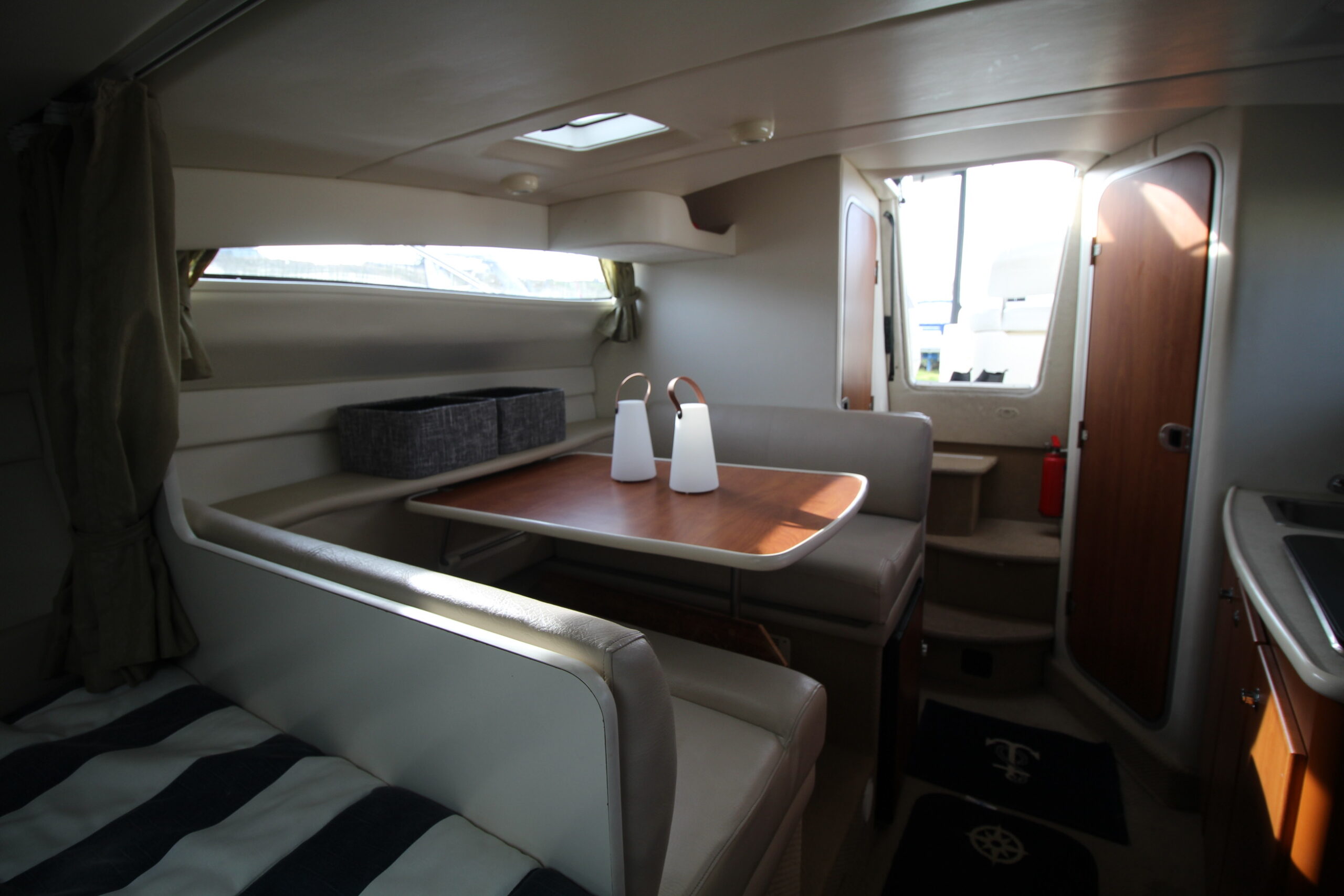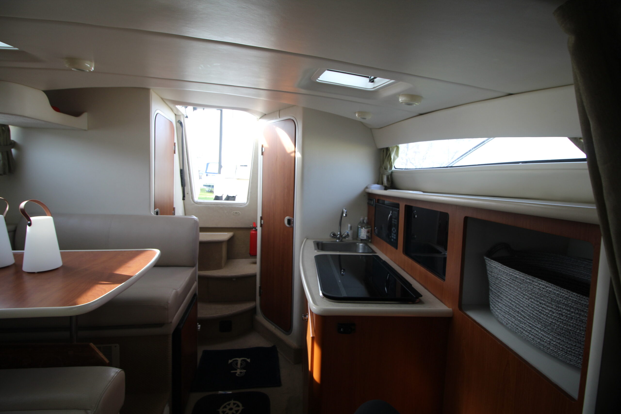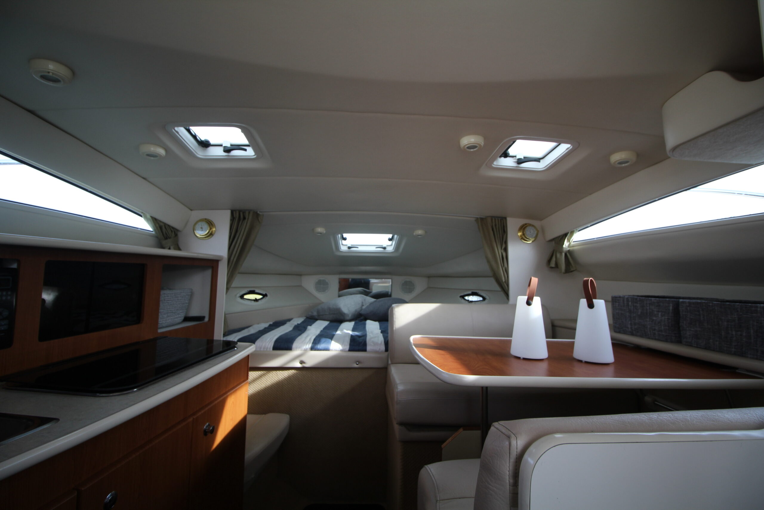 Dobbeltkøje i forskibet - midtskibs sidegruppe med bord i SB - Pantry i BB-side med vask, blus, mikroovn mv. - Seperat toilet med bad - Helt agter ligeledes en dobbeltkøje. I alt 6 sovepladser om læ.
