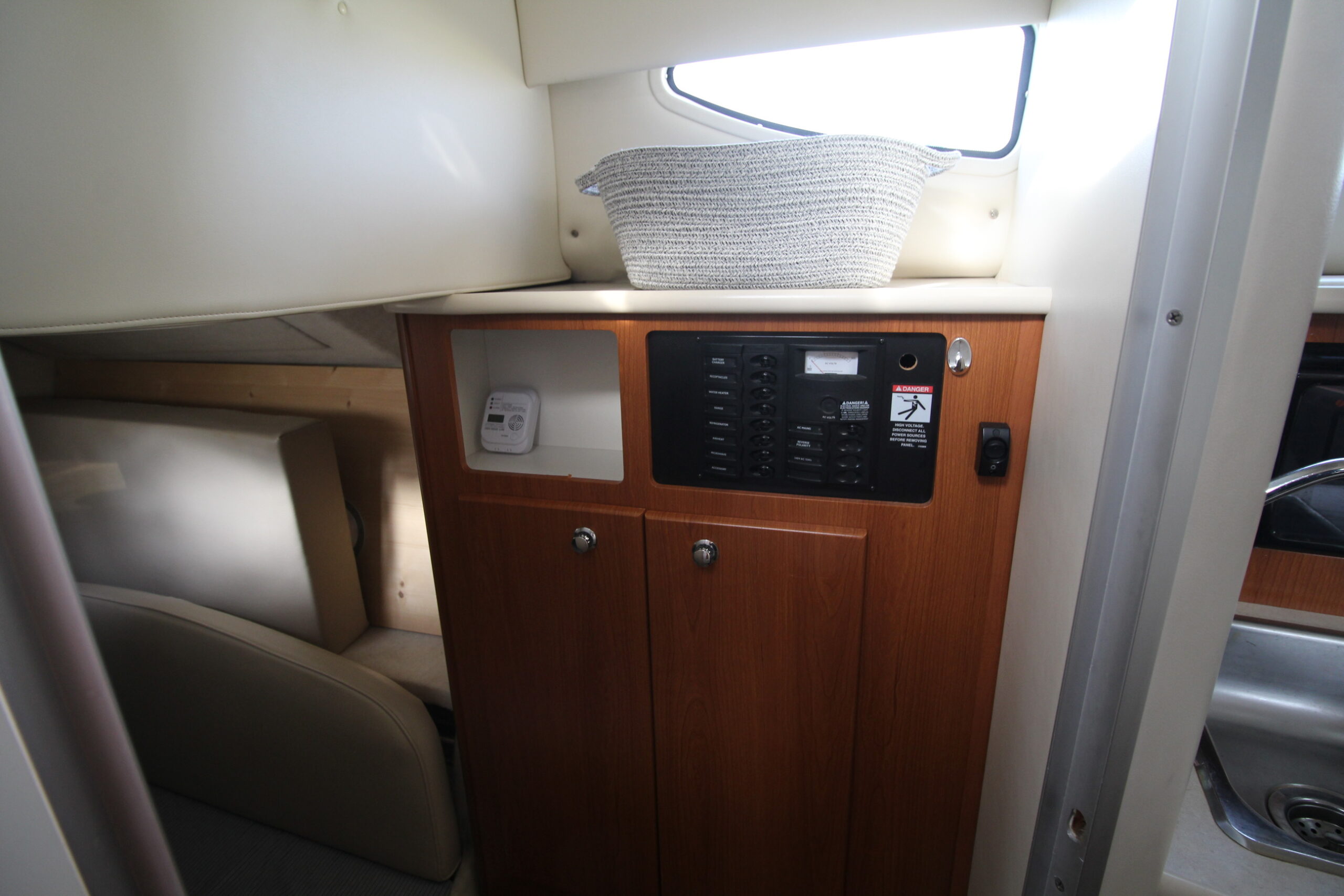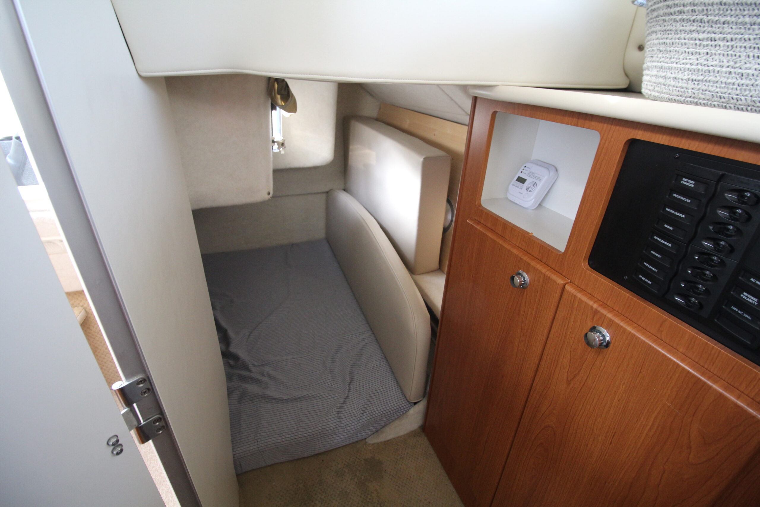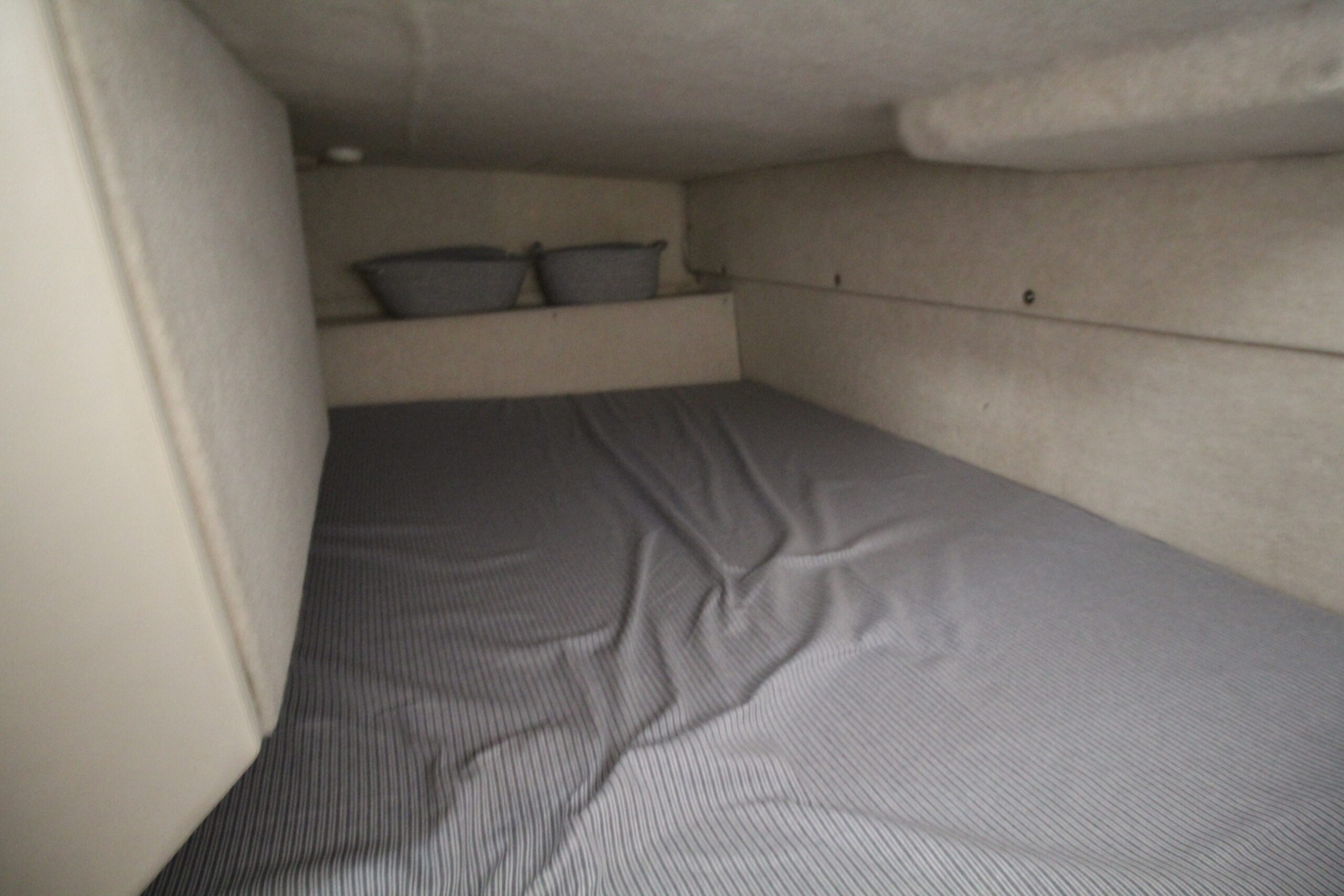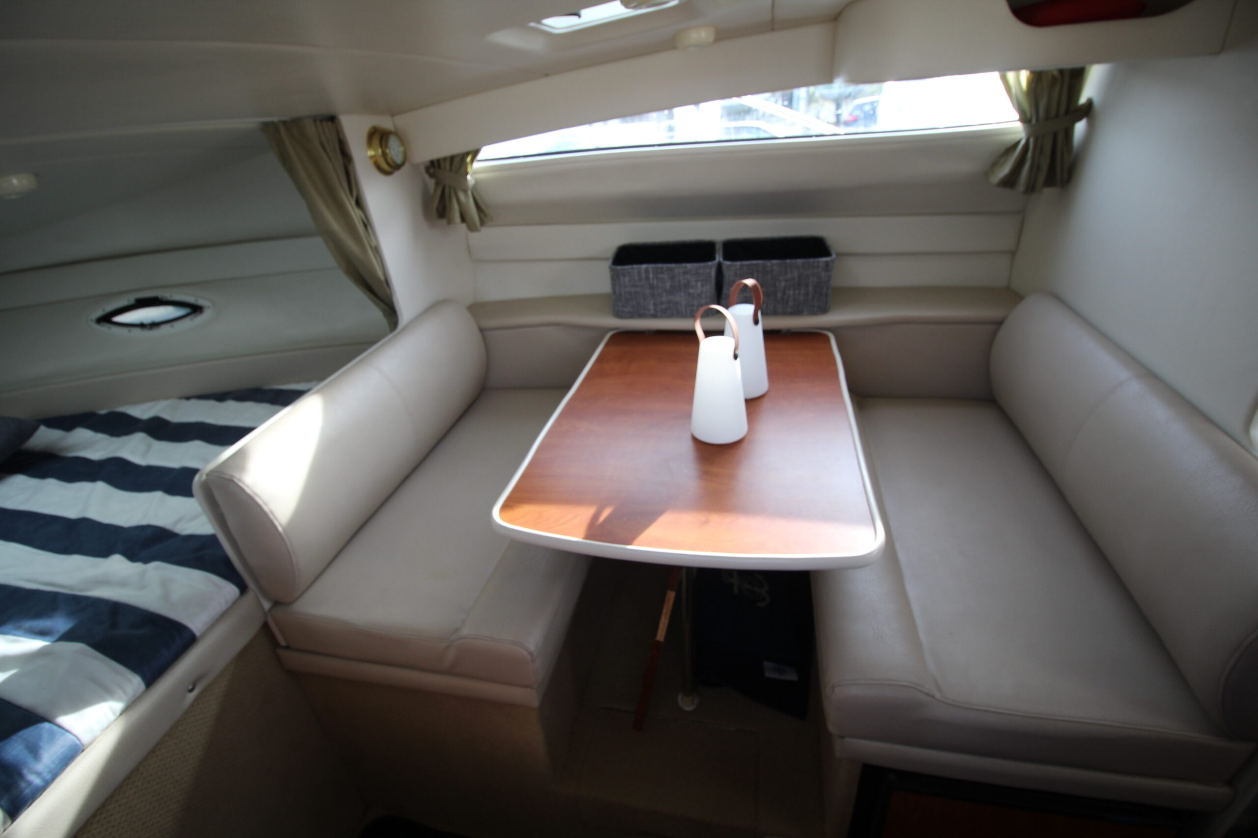 Dobbeltkøje i forskibet - midtskibs sidegruppe med bord i SB - Pantry i BB-side med vask, blus, mikroovn mv. - Seperat toilet med bad - Helt agter ligeledes en dobbeltkøje. I alt 6 sovepladser om læ.