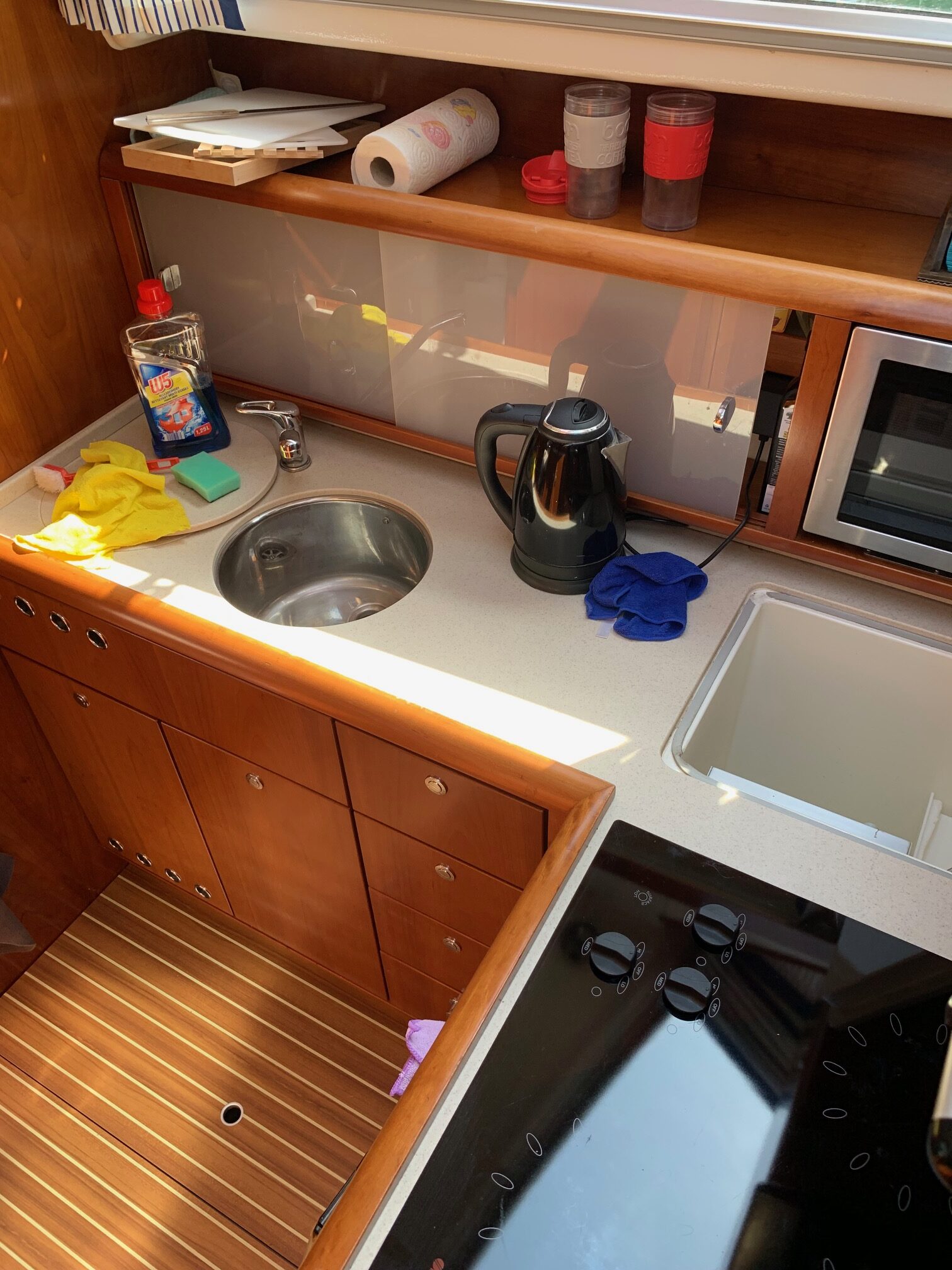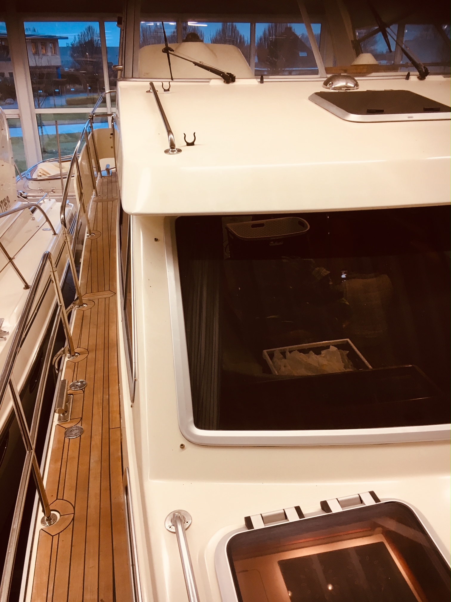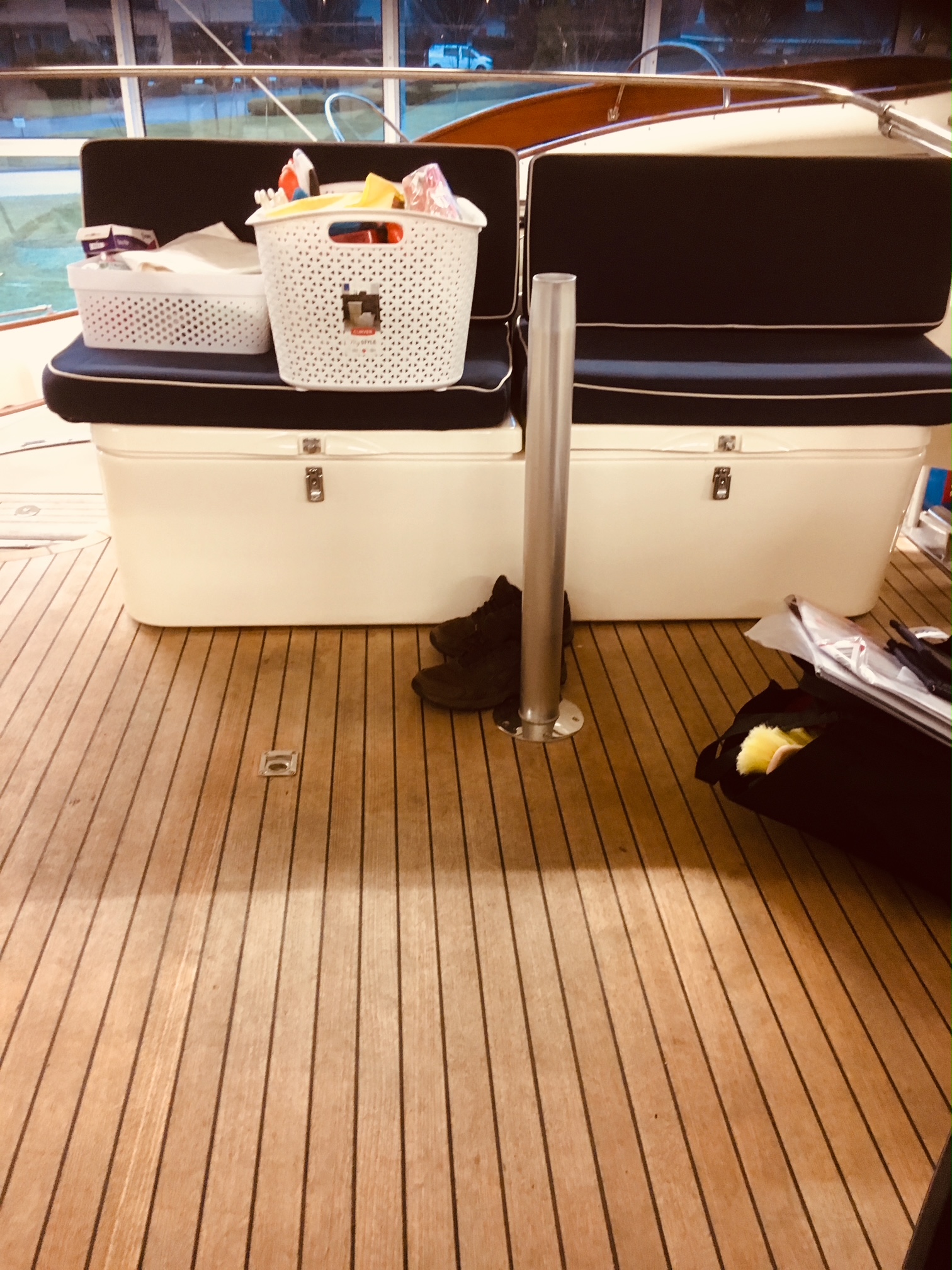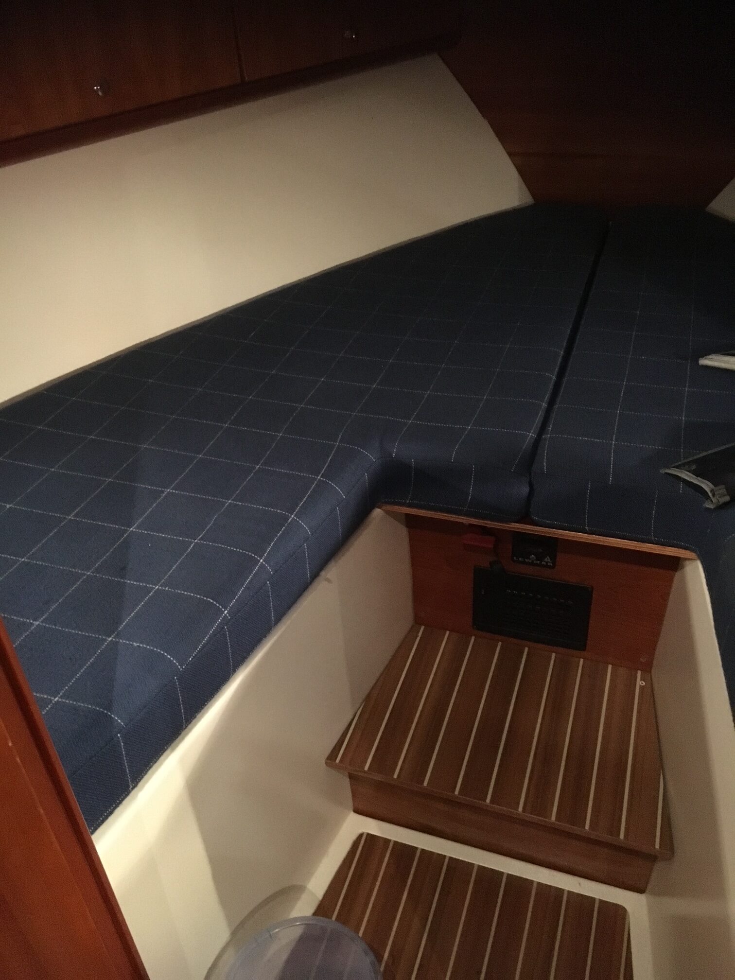 Dejligt og renoveret teakdæk med plads til solbadning på fordækket og fint med plads til at komme rund på båden, også på sidedækket. Kraftigt og højt søgelænder øger komfort og sikkerhed. Kæmpe badeplatform med badestige og bruser. Cockpittet er som nævnt en klasse for sig. Fine sidepladser og nyere sprayhood/kaleche, så der kan lukkes af for blæst, dug og regn.