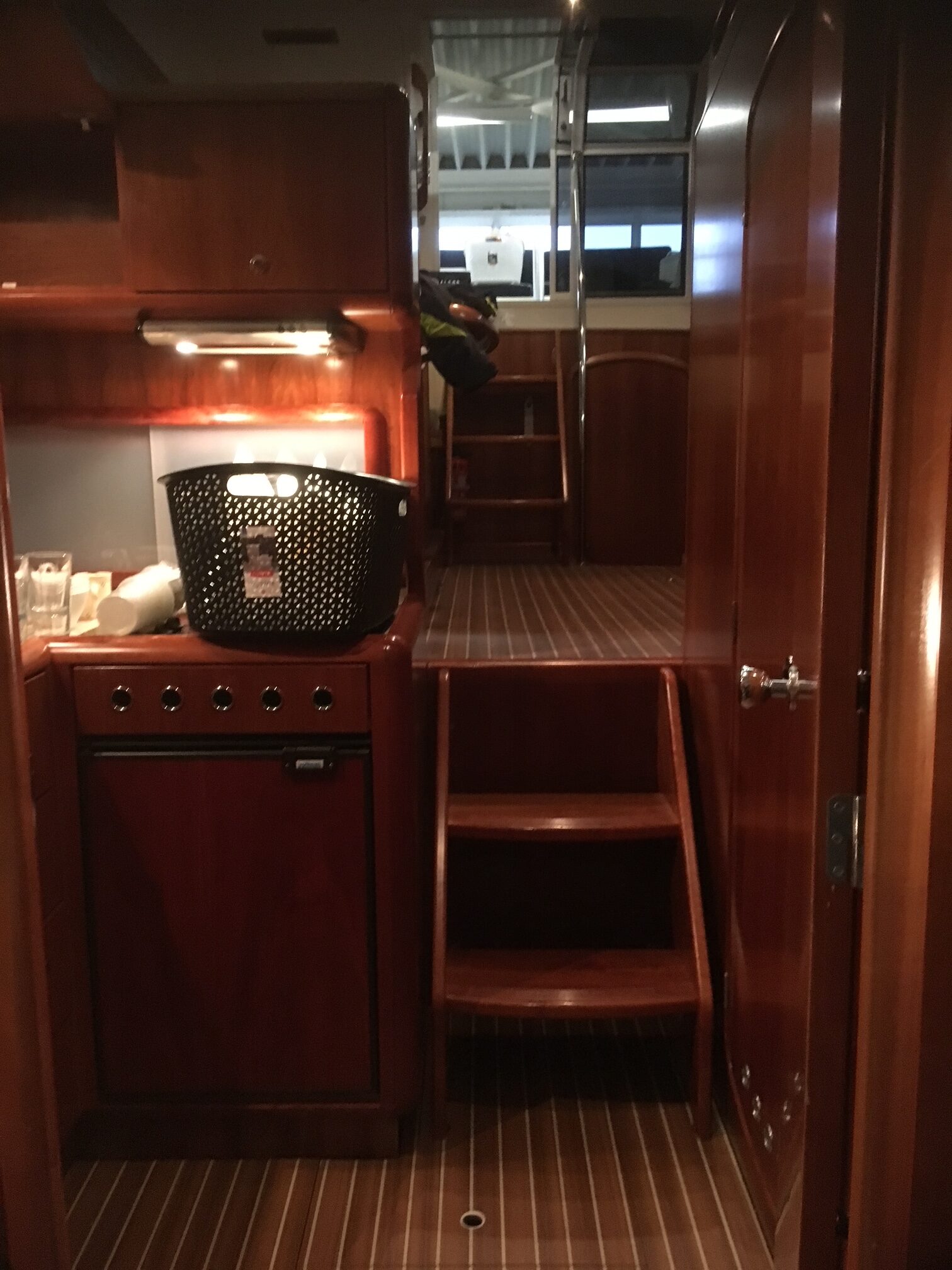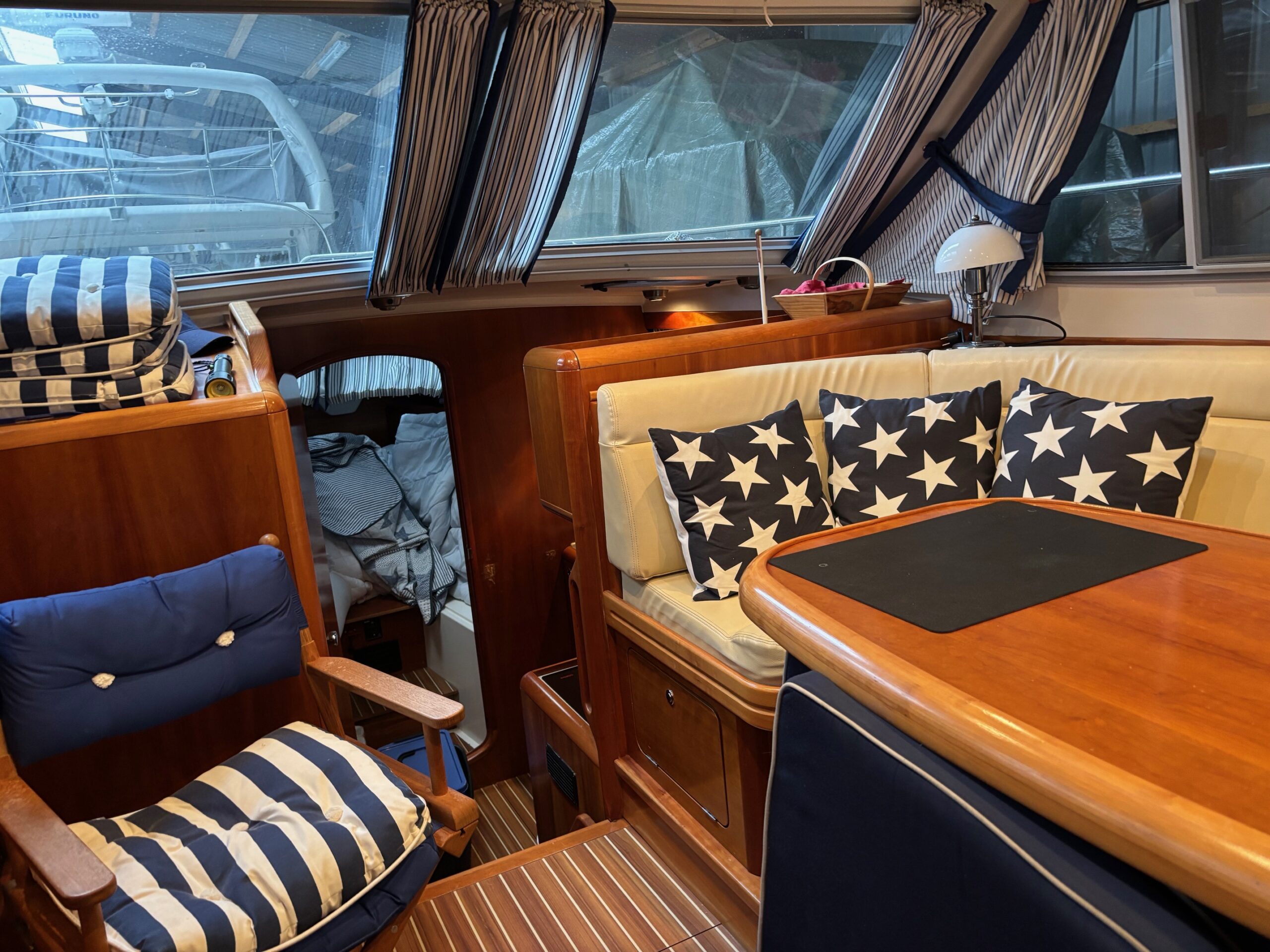 Den rummelige agterkahyt (AC – Aft Cabin) giver en komfortabel og privat owners cabin med god ståhøjde og masser af opbevaringsplads. Adgang til badeværelse. Skøn Salon med lysindretning skaber et indbydende opholdsrum med panoramaudsyn, hvor familie og gæster kan samles. Det veludstyrede pantry gør det nemt at tilberede måltider ombord. Længere fremme mellemgang, der fører til seperat toilet og forkahyt med 2 sovepladser.