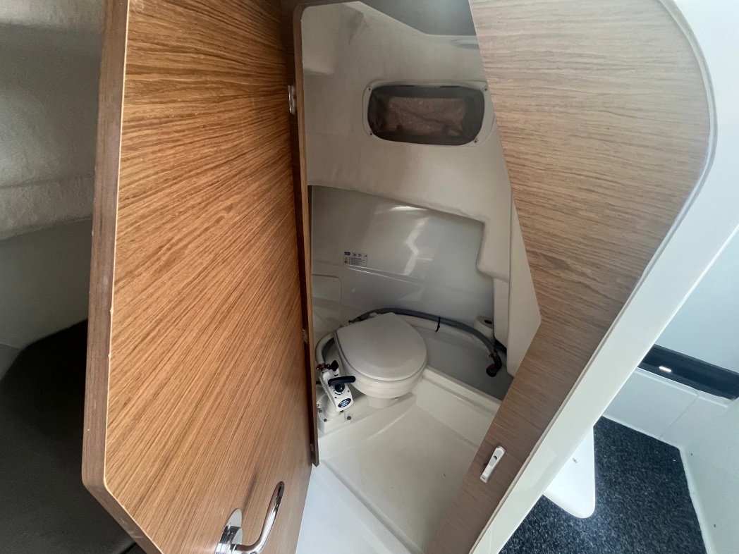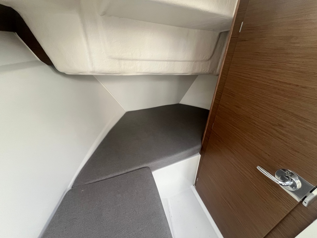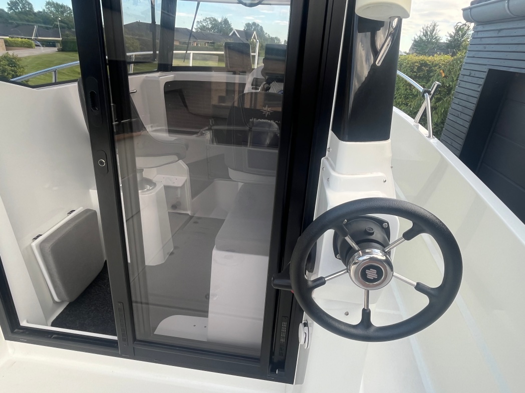 En dejlig indretning med stort styrehus der imponere med god plads og et skønt lysindfald fra vinduer, skylight og skydedøre. Forrest kompakt kahyt med en soveplads og seperat toilet.