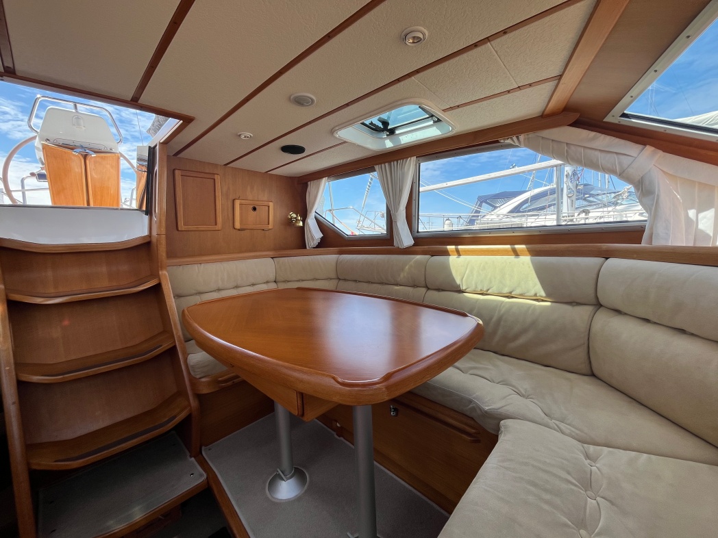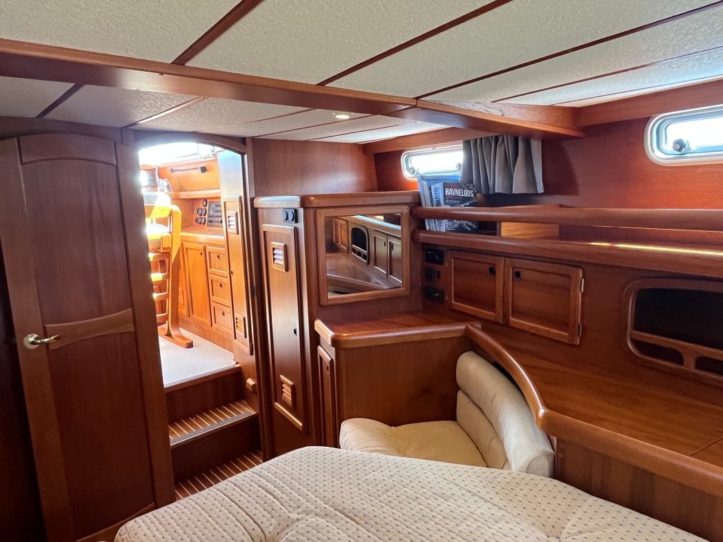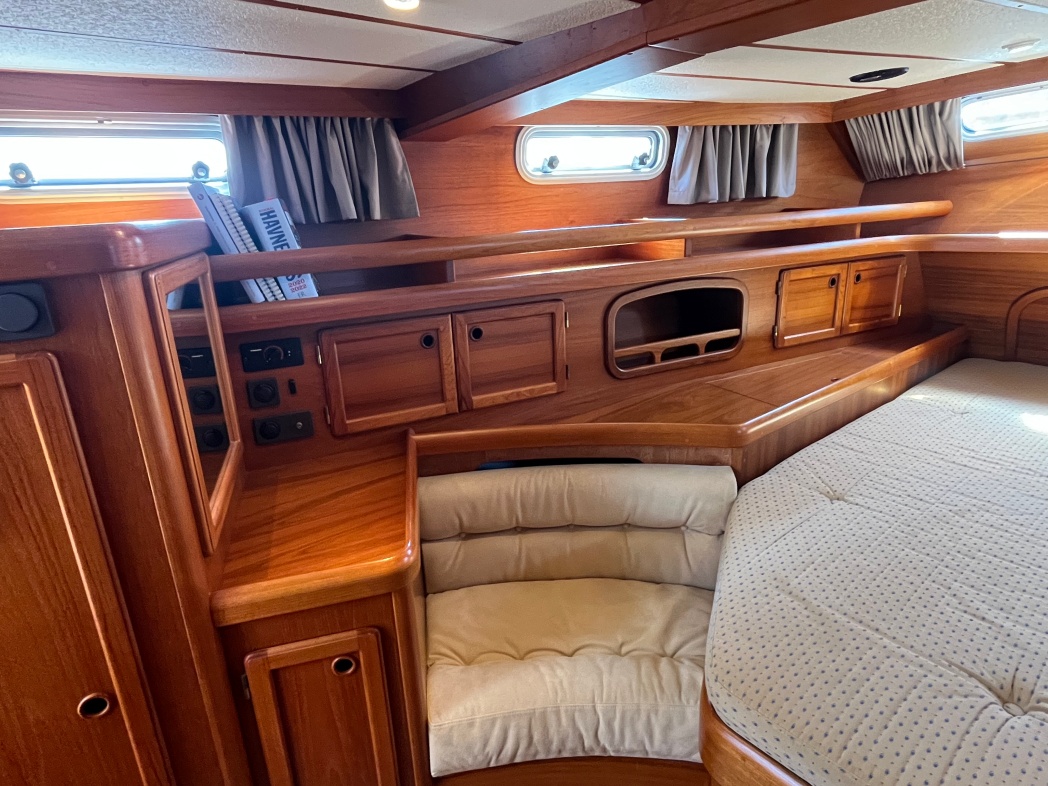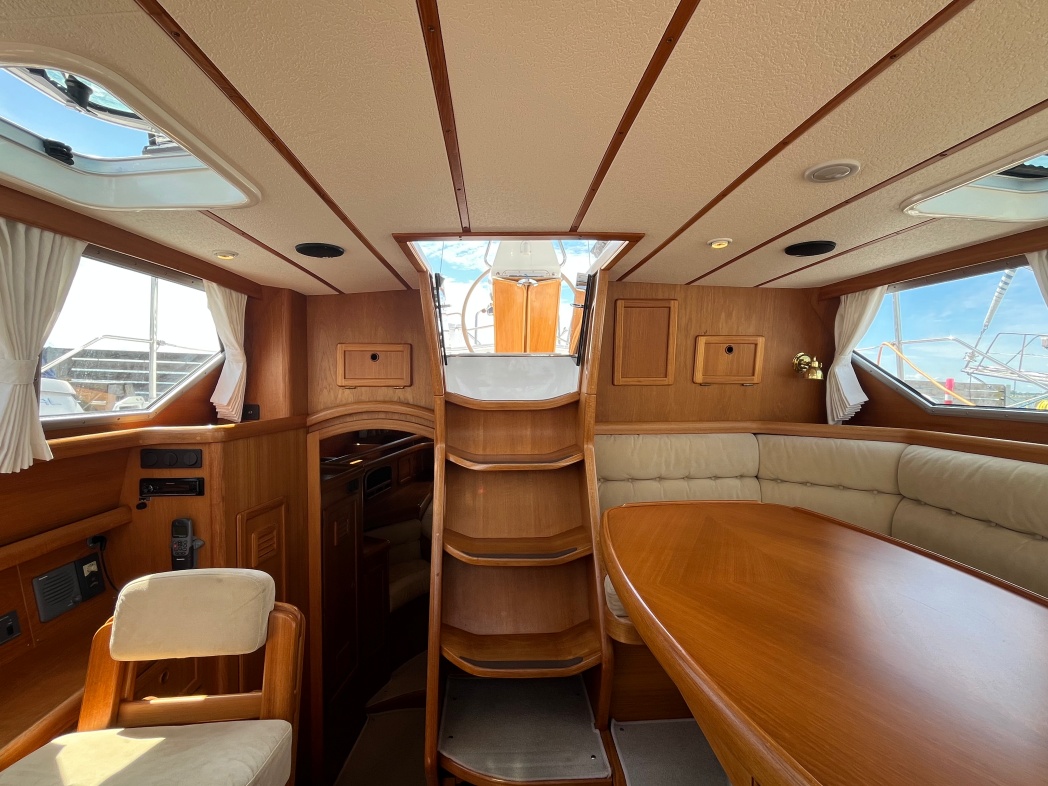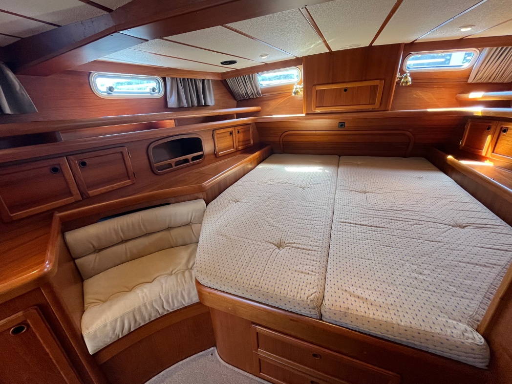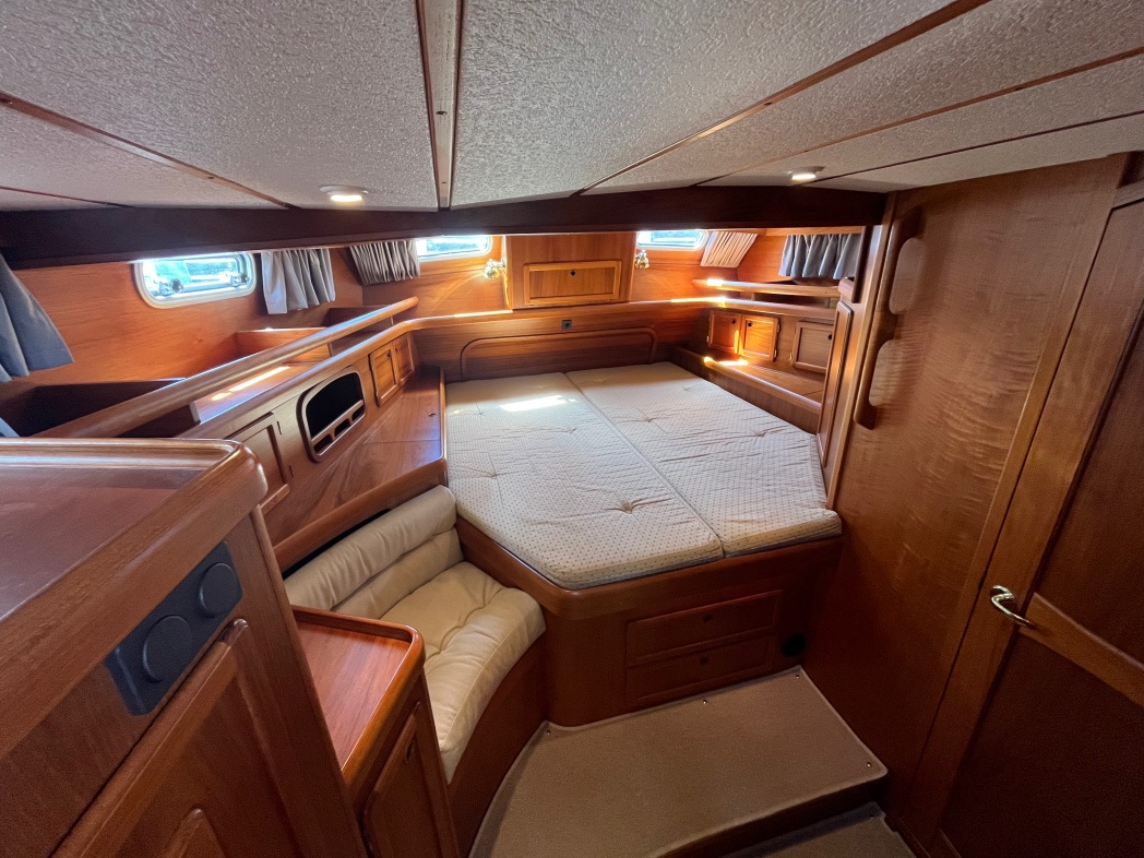 Skøn dæksalon med U-sofa og bord i BB-side og styreplads og teknik i STB-side. Den specialdesignede styrestol er ikke fastmonteret, hvilket er et stort plus, da den også kan fungere til andet. Lysindfaldet er overdådigt og modsat traditionelle sejlbåde, hvor man går i ”kælderen”, så kan man følge med i sejladsen og havnelivet fra dæksalonen. Længere fremme i skibet er et stort langsgående pantry med god udluftning fra skylights. Sovekabine modsat pantry, herefter badeværelse og forrest i skibet er forpeak med 2 + 1 sovepladser. Noget der ene og alene kan sælge denne Nauticat 37 er dens imponerede Owners Cabin. Stor dobbeltseng, makeup-spejl og dejligt badeværelse.