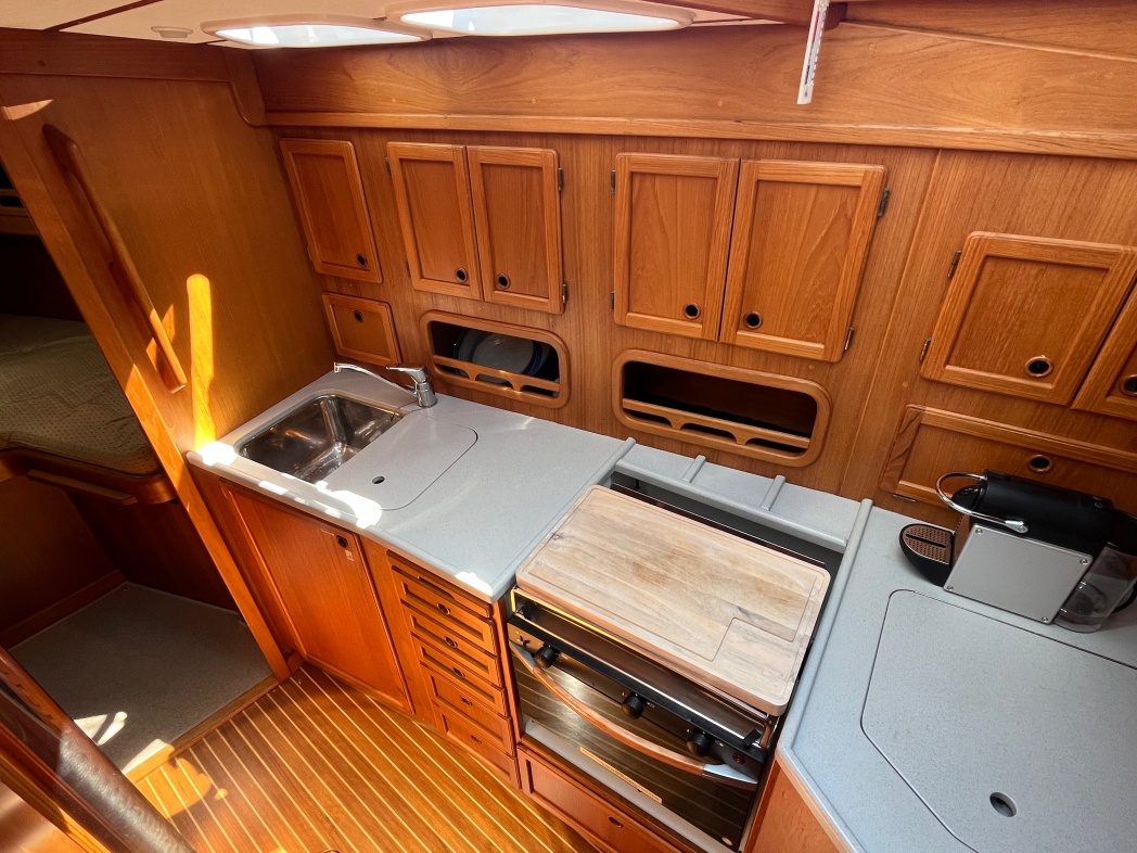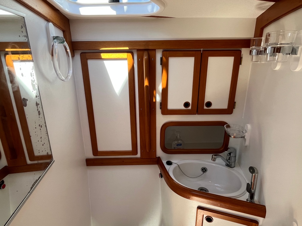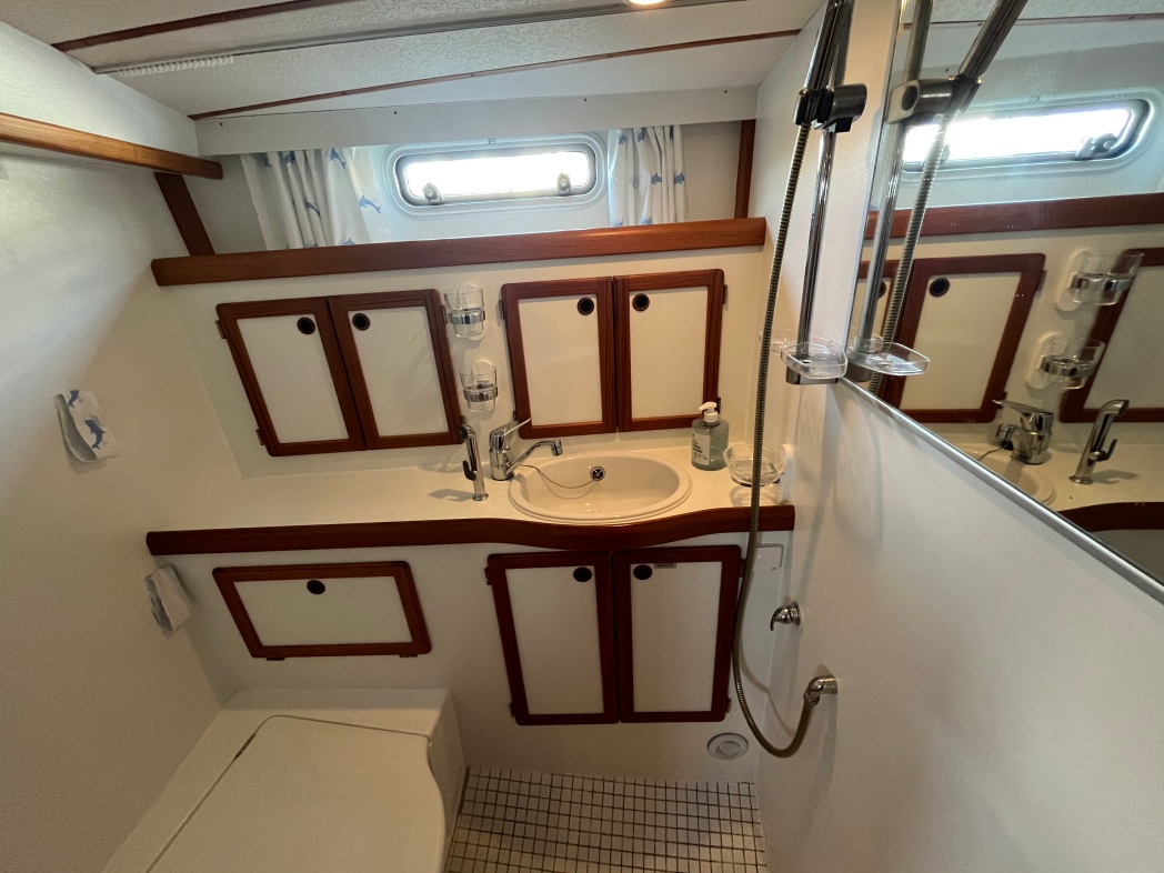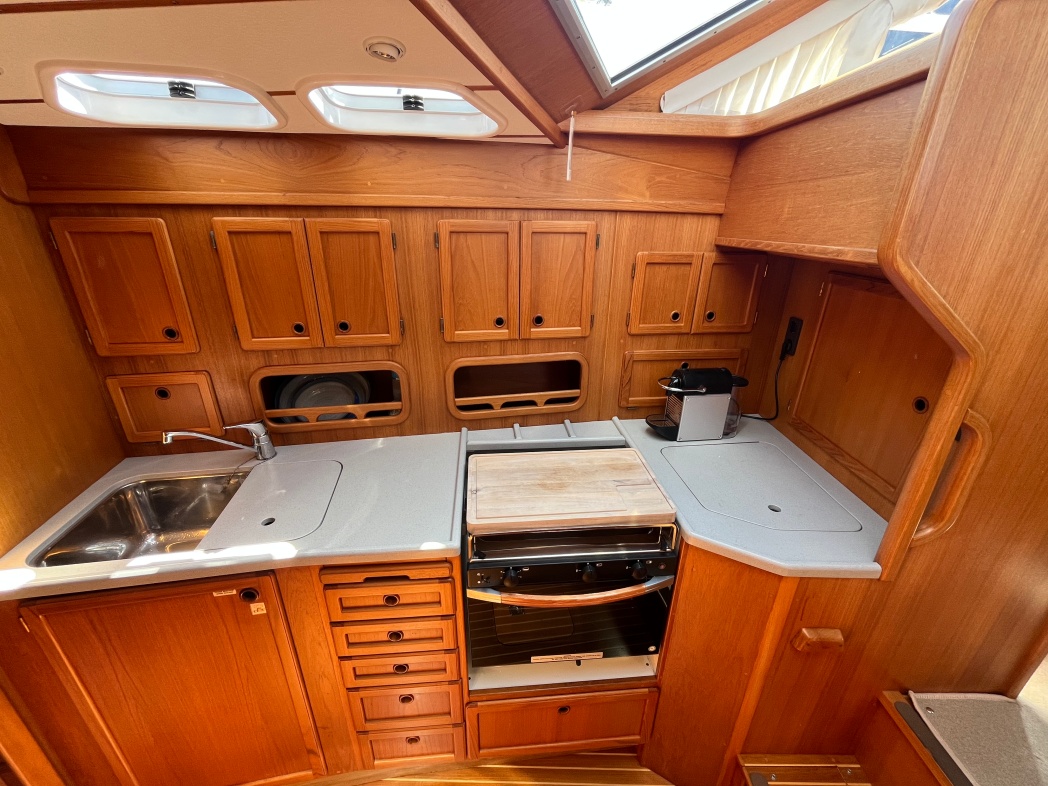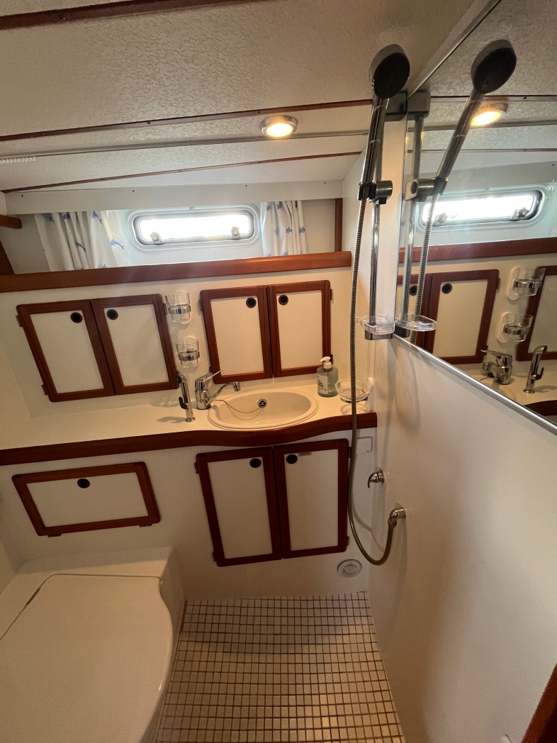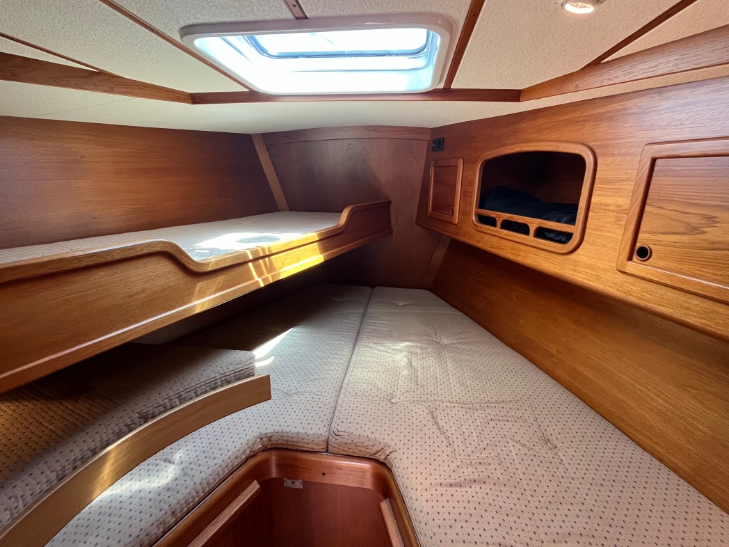 Skøn dæksalon med U-sofa og bord i BB-side og styreplads og teknik i STB-side. Den specialdesignede styrestol er ikke fastmonteret, hvilket er et stort plus, da den også kan fungere til andet. Lysindfaldet er overdådigt og modsat traditionelle sejlbåde, hvor man går i ”kælderen”, så kan man følge med i sejladsen og havnelivet fra dæksalonen. Længere fremme i skibet er et stort langsgående pantry med god udluftning fra skylights. Sovekabine modsat pantry, herefter badeværelse og forrest i skibet er forpeak med 2 + 1 sovepladser. Noget der ene og alene kan sælge denne Nauticat 37 er dens imponerede Owners Cabin. Stor dobbeltseng, makeup-spejl og dejligt badeværelse.