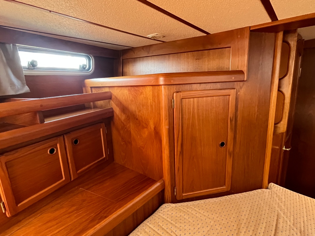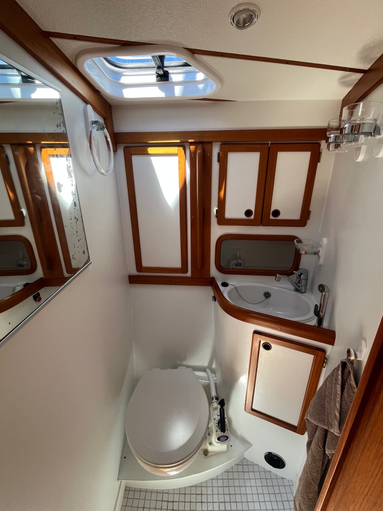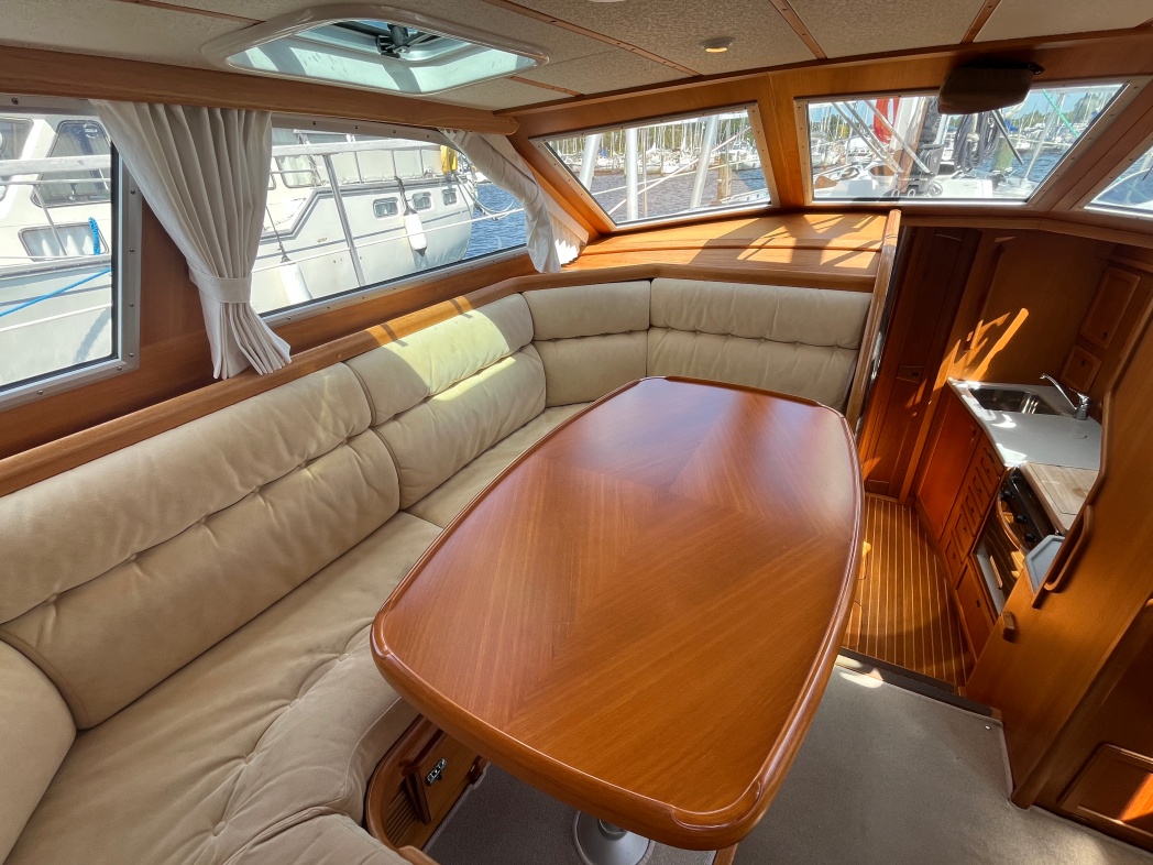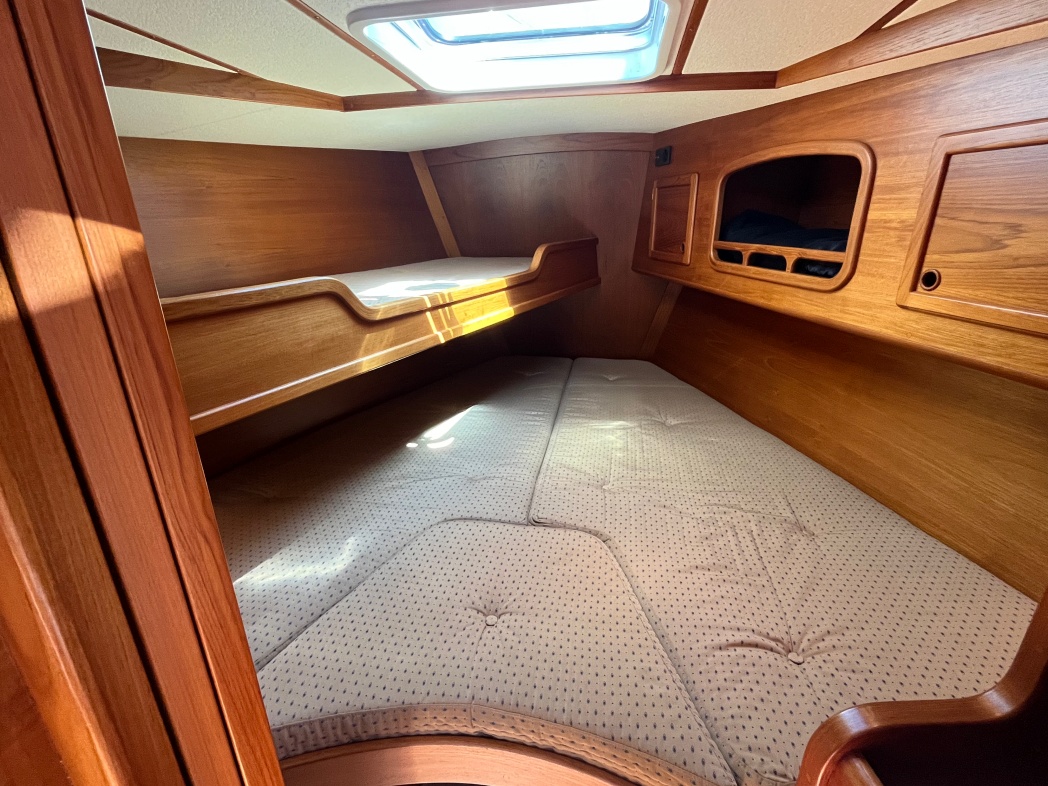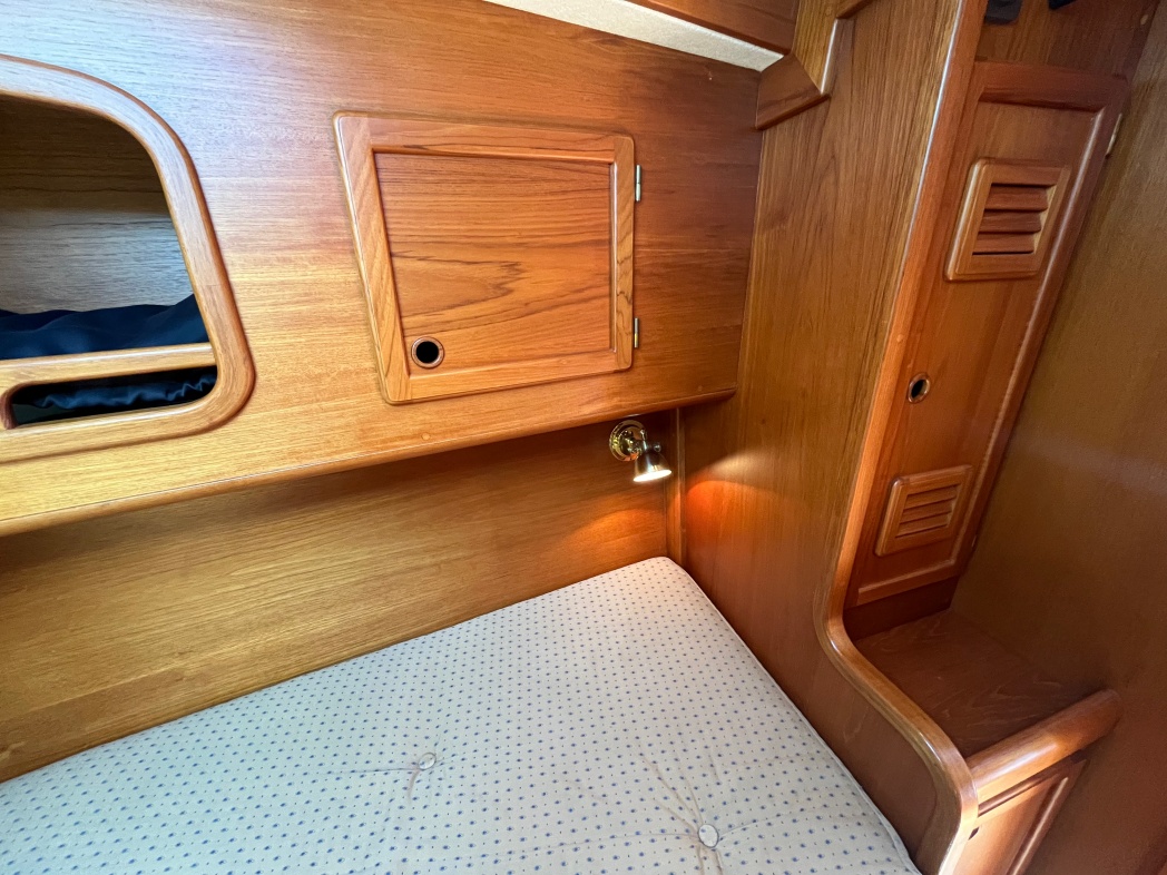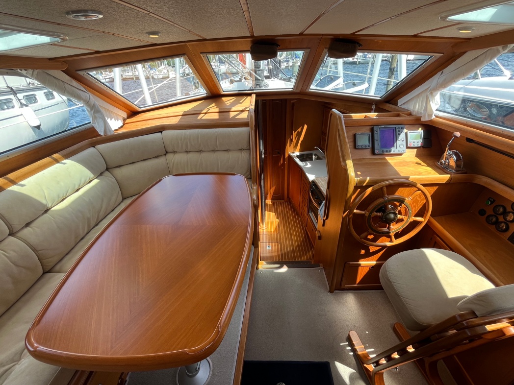 Skøn dæksalon med U-sofa og bord i BB-side og styreplads og teknik i STB-side. Den specialdesignede styrestol er ikke fastmonteret, hvilket er et stort plus, da den også kan fungere til andet. Lysindfaldet er overdådigt og modsat traditionelle sejlbåde, hvor man går i ”kælderen”, så kan man følge med i sejladsen og havnelivet fra dæksalonen. Længere fremme i skibet er et stort langsgående pantry med god udluftning fra skylights. Sovekabine modsat pantry, herefter badeværelse og forrest i skibet er forpeak med 2 + 1 sovepladser. Noget der ene og alene kan sælge denne Nauticat 37 er dens imponerede Owners Cabin. Stor dobbeltseng, makeup-spejl og dejligt badeværelse.