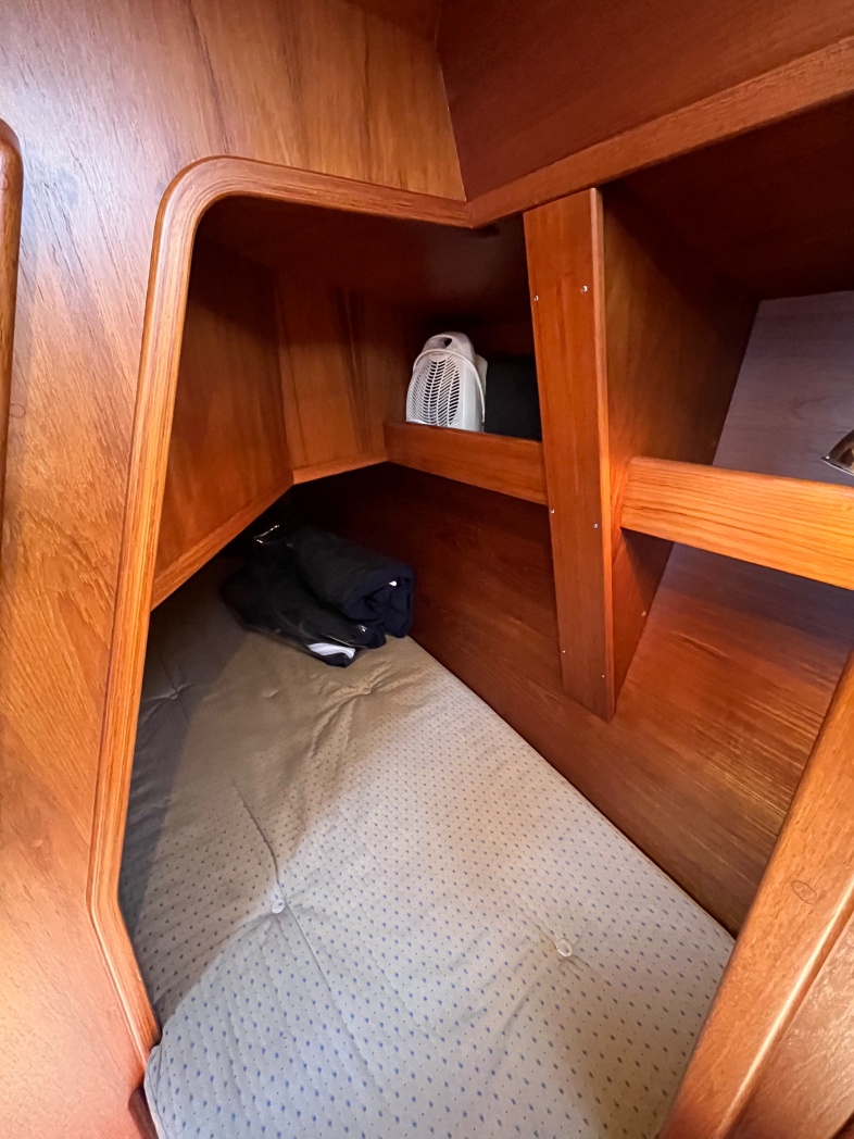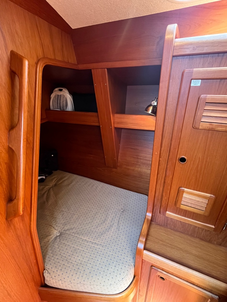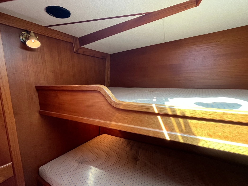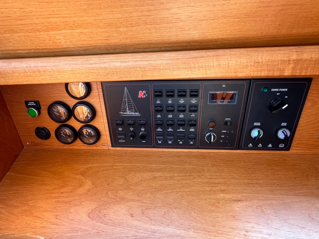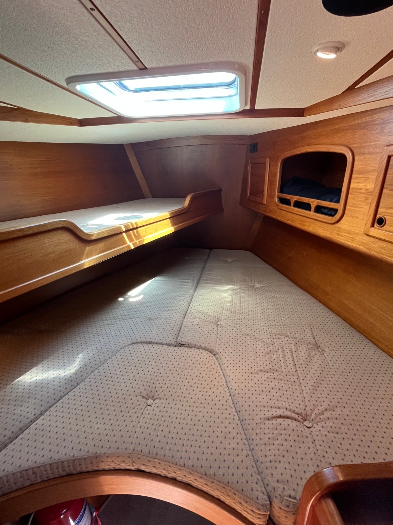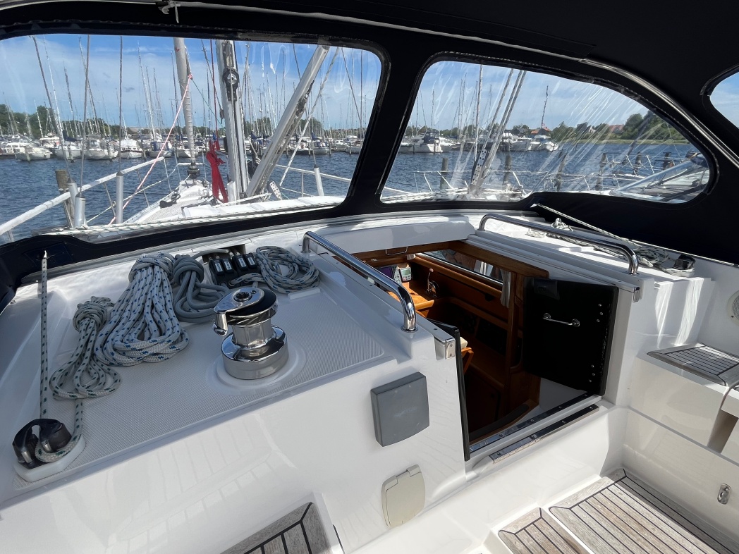 Skøn dæksalon med U-sofa og bord i BB-side og styreplads og teknik i STB-side. Den specialdesignede styrestol er ikke fastmonteret, hvilket er et stort plus, da den også kan fungere til andet. Lysindfaldet er overdådigt og modsat traditionelle sejlbåde, hvor man går i ”kælderen”, så kan man følge med i sejladsen og havnelivet fra dæksalonen. Længere fremme i skibet er et stort langsgående pantry med god udluftning fra skylights. Sovekabine modsat pantry, herefter badeværelse og forrest i skibet er forpeak med 2 + 1 sovepladser. Noget der ene og alene kan sælge denne Nauticat 37 er dens imponerede Owners Cabin. Stor dobbeltseng, makeup-spejl og dejligt badeværelse.
