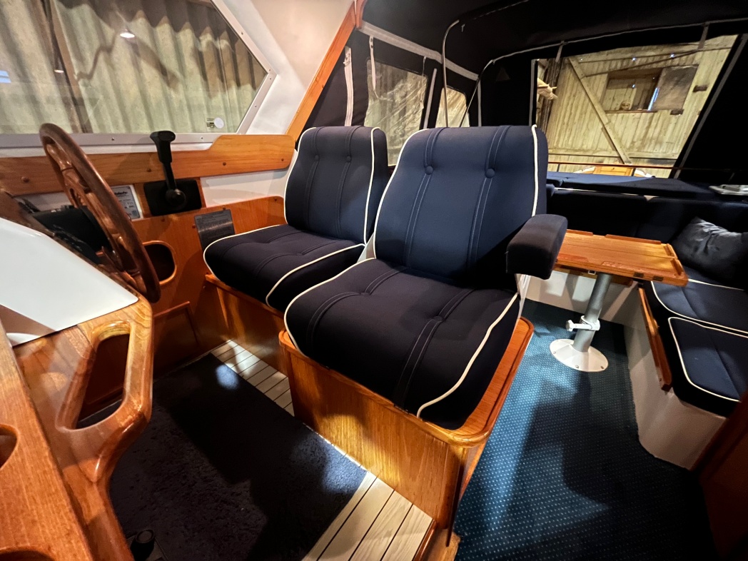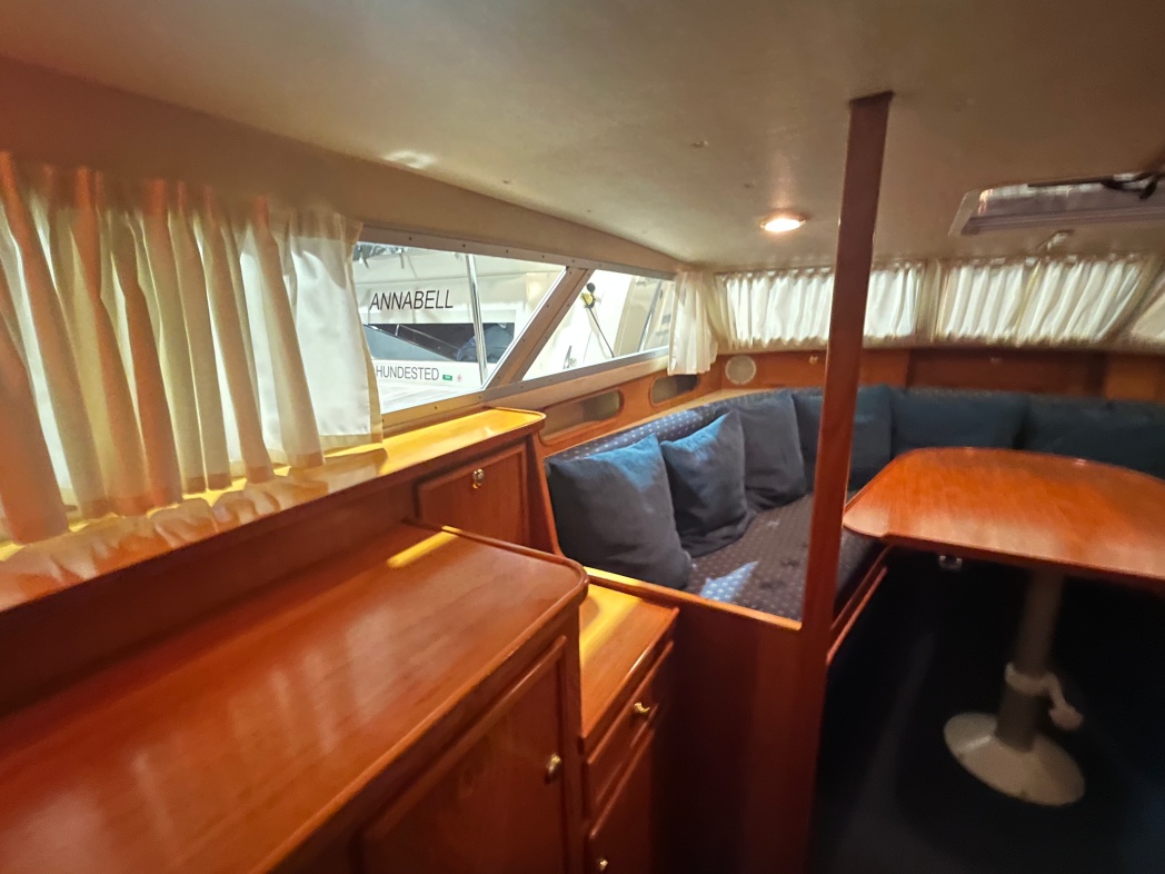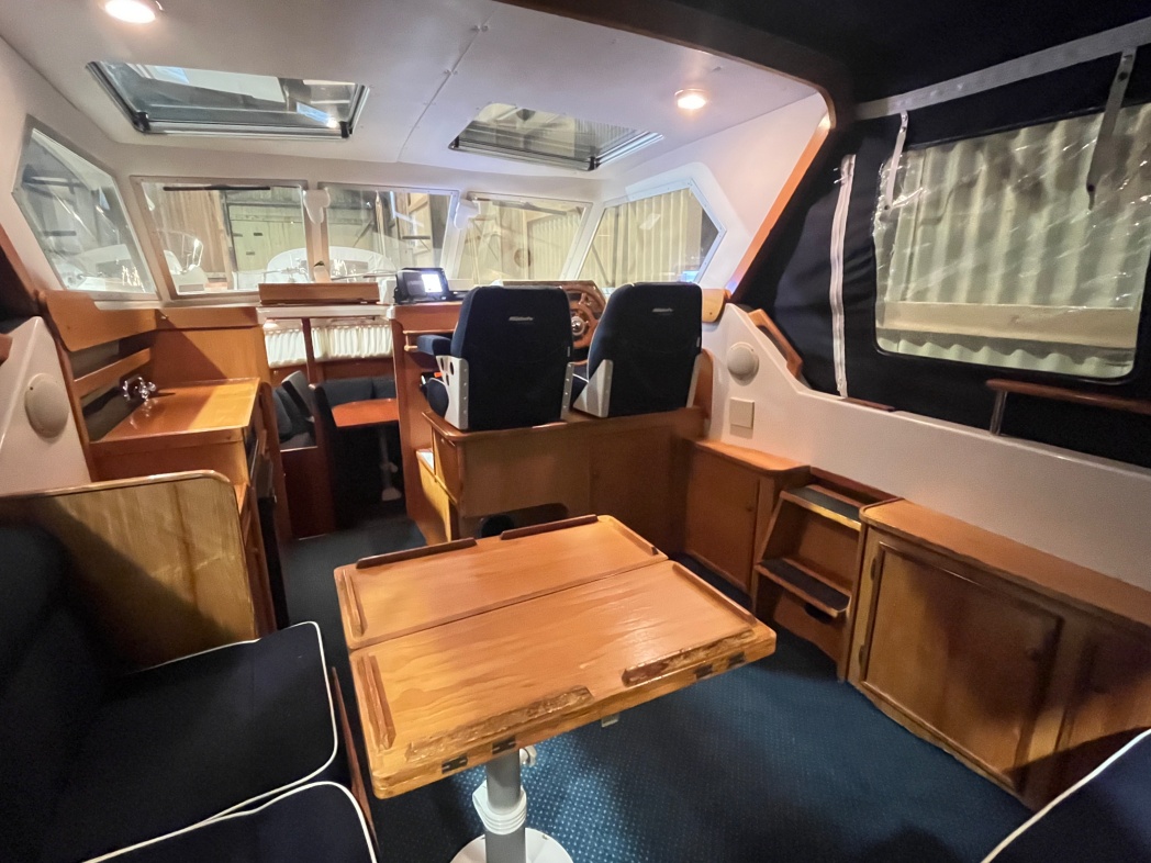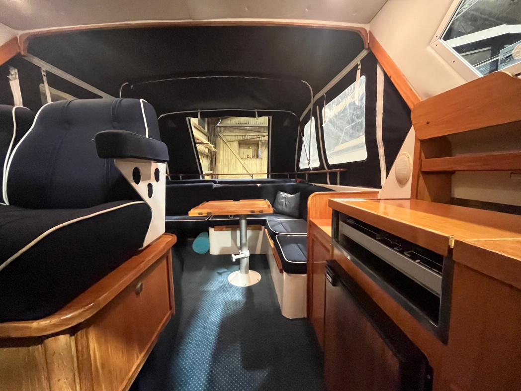 Centralt placeret og meget rummeligt cockpit - kan lukkes helt af med hardtop og kaleche. Indrettet med styreplads og co-pilot sæde i STB-side. Praktisk langsgående pantry i BB-side. Bagerst sofaområde med bord med masser af sidepladser. Fra cockpit adgang til separat agterkahyt med god dobbeltseng og fine skabe til tøj og grej. "Taget" til agterkahytten fungerer ligeledes som solseng, hvor I ligger dejligt på de flotte blå hynder.