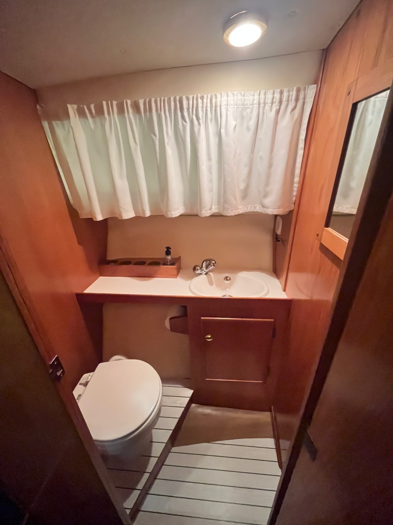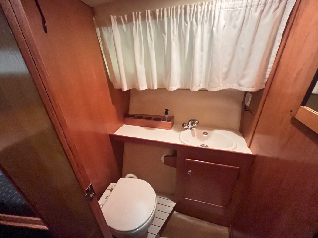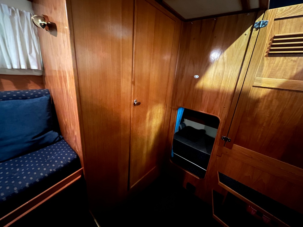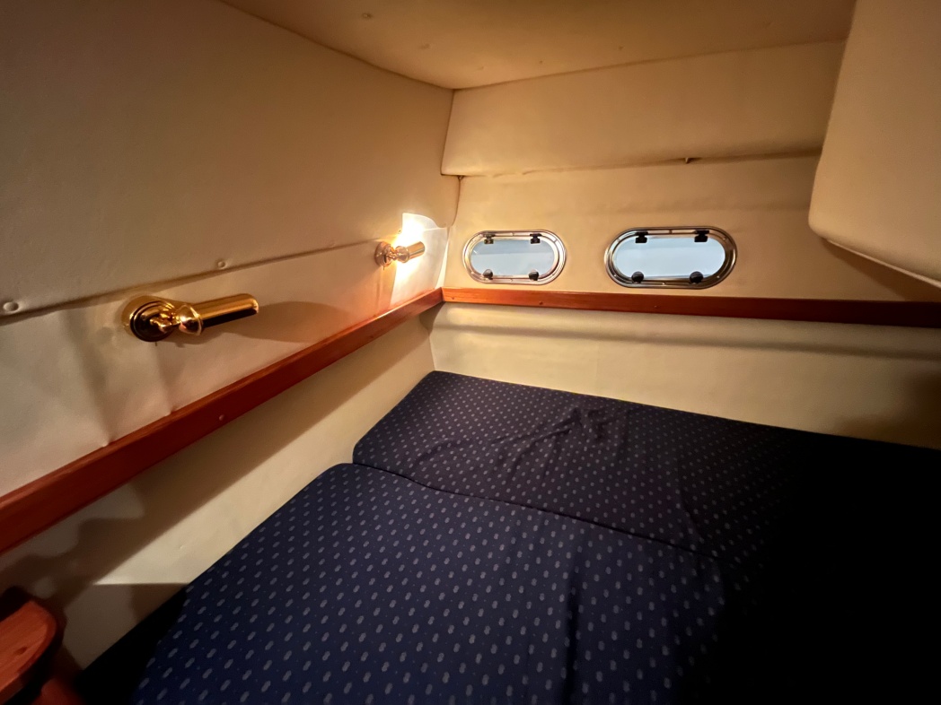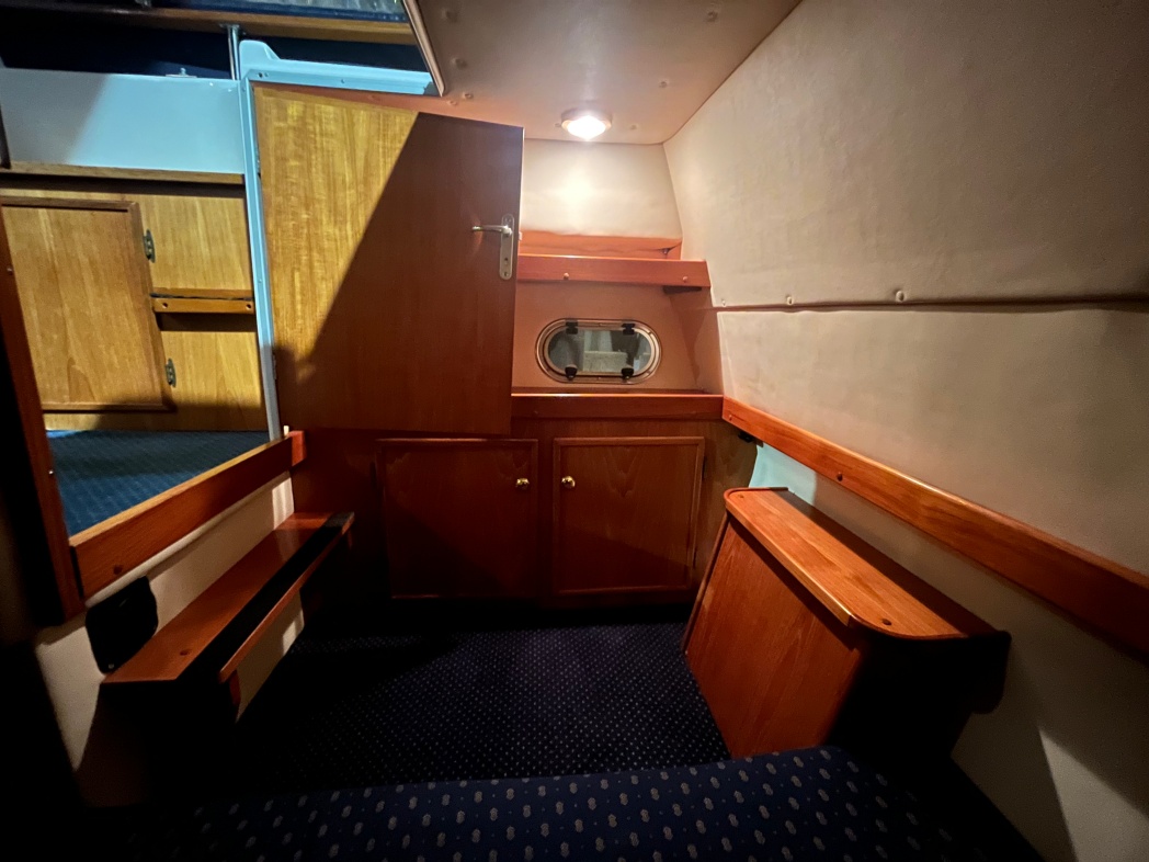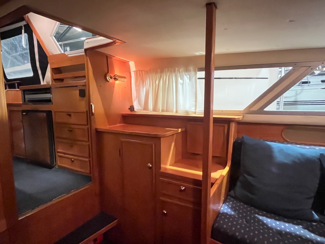 Hovedsalon byder på en stor sofagruppe, der nemt omdannes til dobbeltseng. Agter  afhovedsalon finder du en stikkøje. I STB-side toiletrum. Store og mange vinduer giver dejligt lysindfald og ingen "kælderfølelse". Mange gode stuverum til opbevaring af grej.