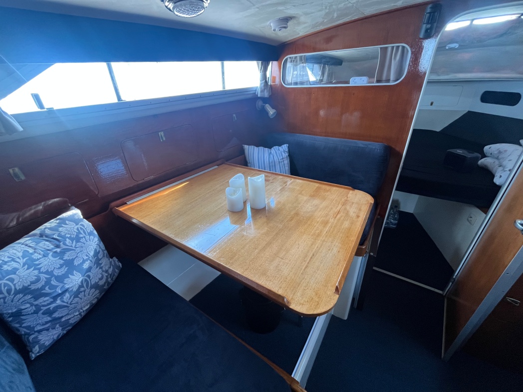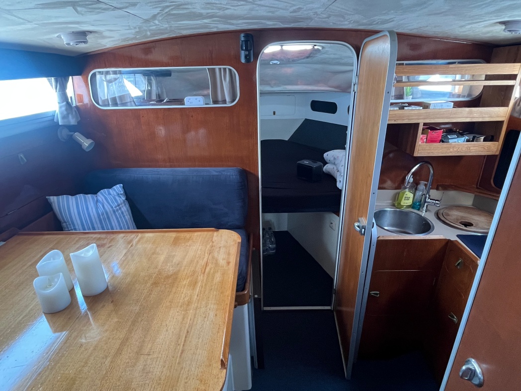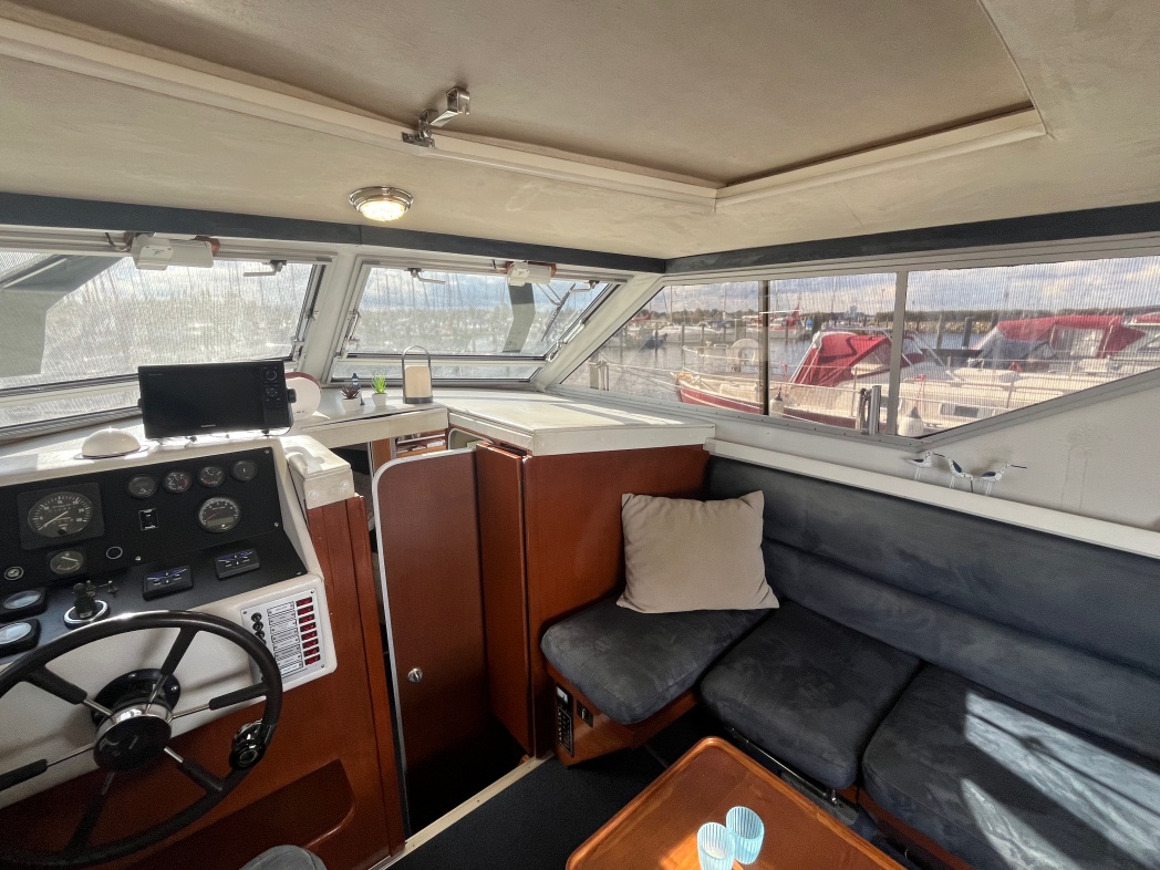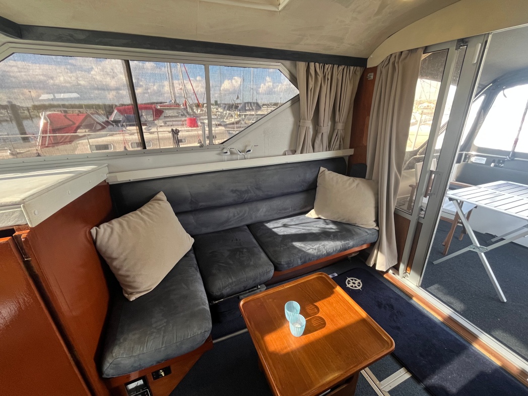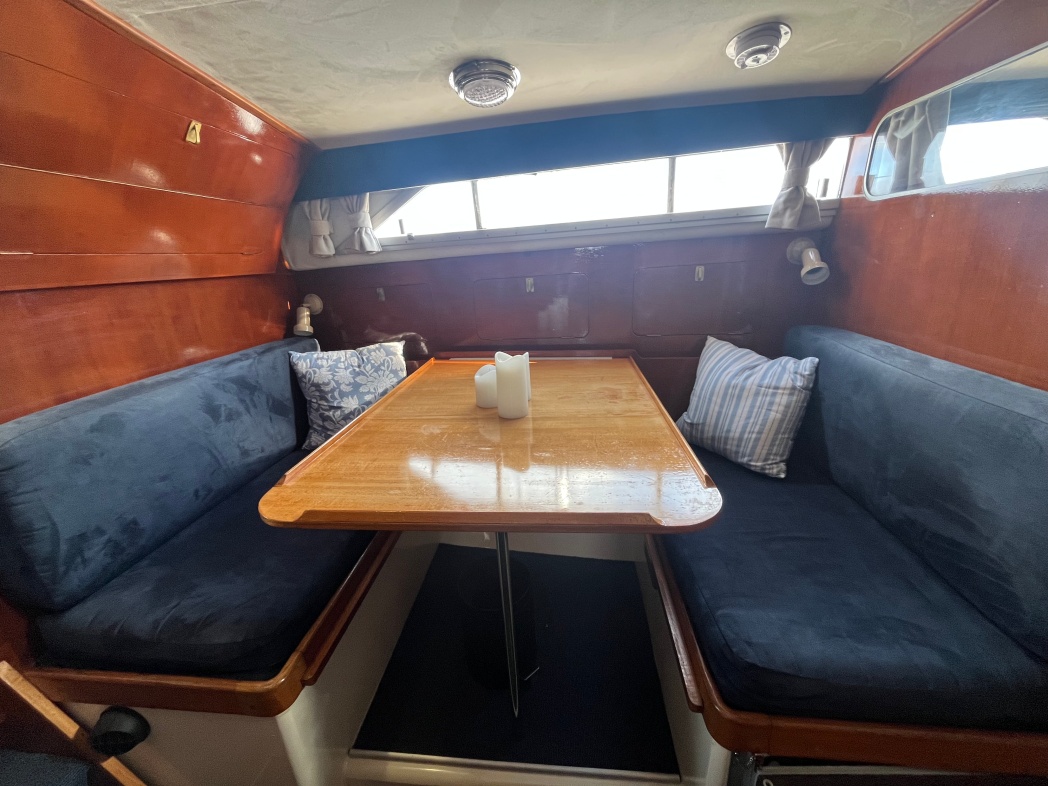 Fra agterdækket træder du ind i dejlig salon med styreplads og sofaer. Et dejlig lysfald skabes fra skydedøren (ud til agterdækket) og fra de store vinduespartier. Nedgang midtskib til pantryområde i STB-side og modsat i BB-side "slyngelstuen" med bord og gode bløde siddepladser. Her kan spises en dejlig middag og fortælles røverhistorier. Forrest i skibet fast sovekabine med god bred dobbeltseng. Yderligere forefindes badeværelse med toilet/brus ombord.