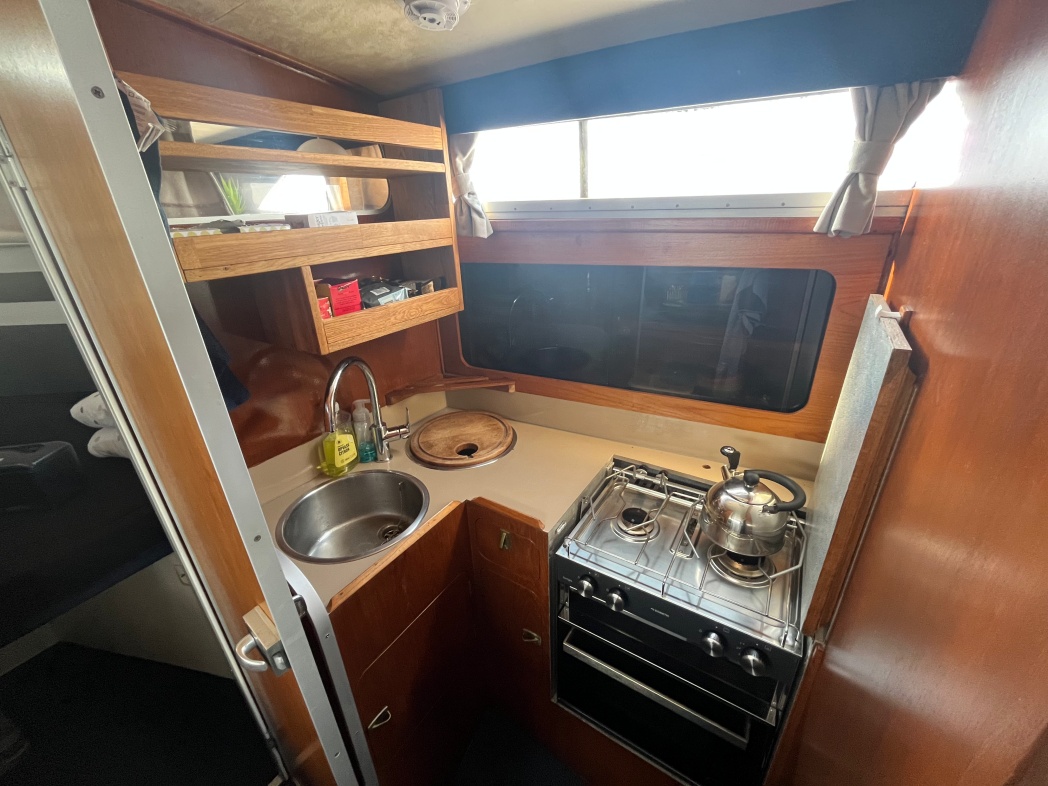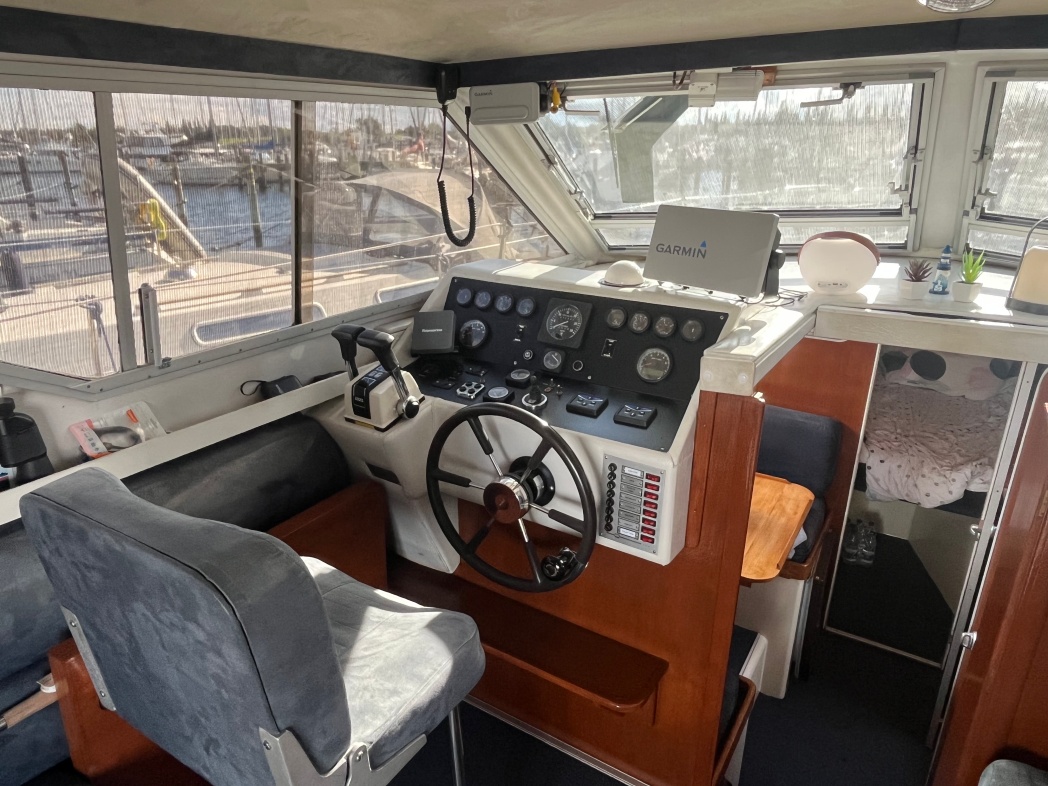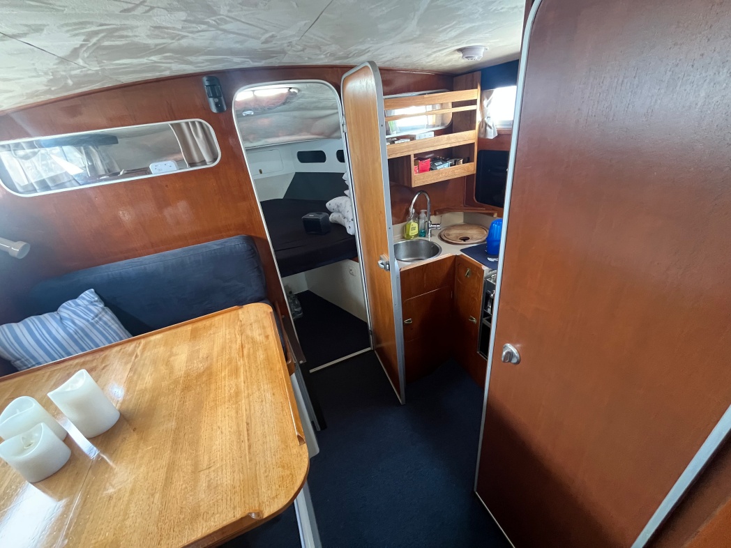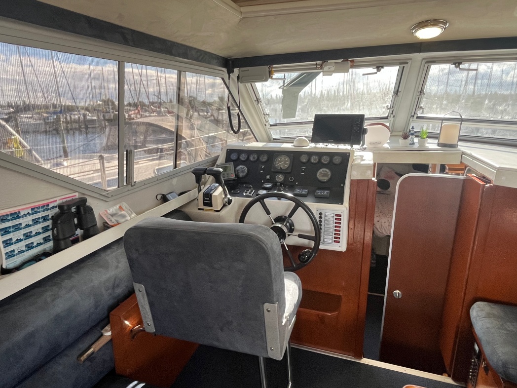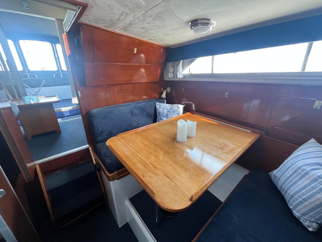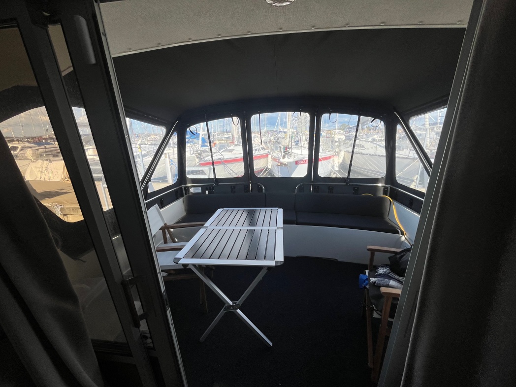 Fra agterdækket træder du ind i dejlig salon med styreplads og sofaer. Et dejlig lysfald skabes fra skydedøren (ud til agterdækket) og fra de store vinduespartier. Nedgang midtskib til pantryområde i STB-side og modsat i BB-side "slyngelstuen" med bord og gode bløde siddepladser. Her kan spises en dejlig middag og fortælles røverhistorier. Forrest i skibet fast sovekabine med god bred dobbeltseng. Yderligere forefindes badeværelse med toilet/brus ombord.
