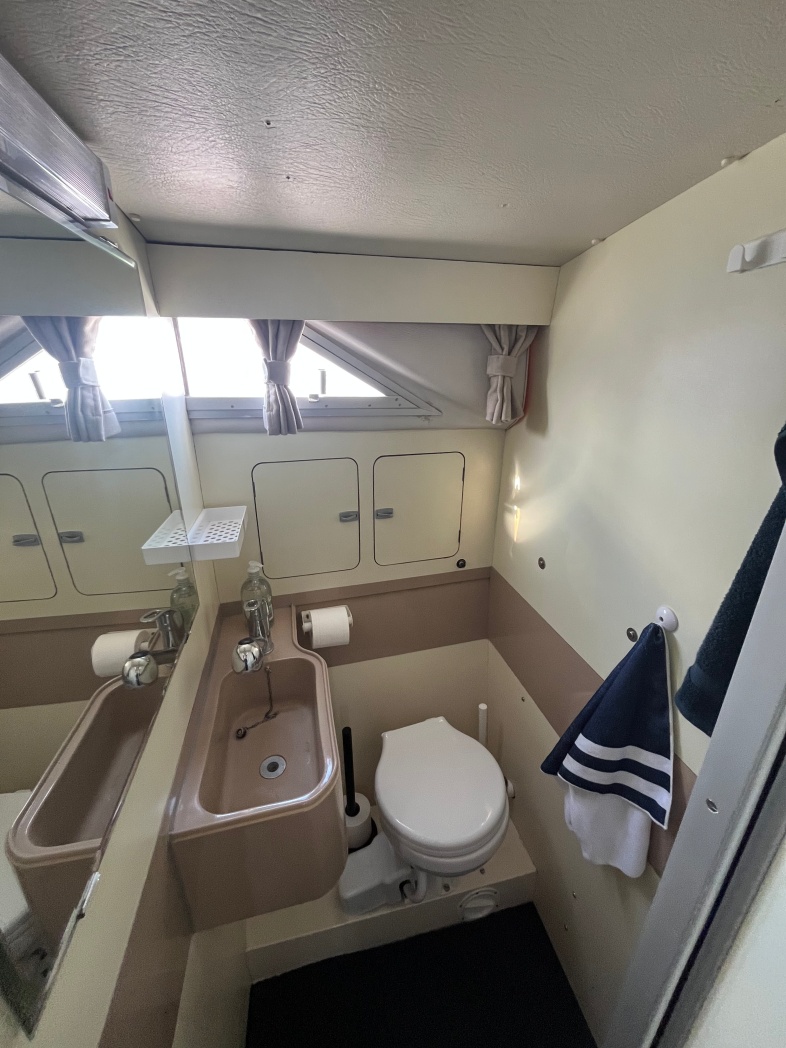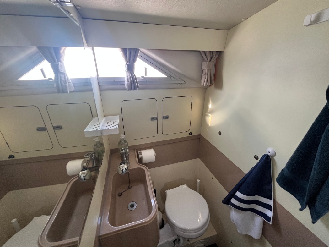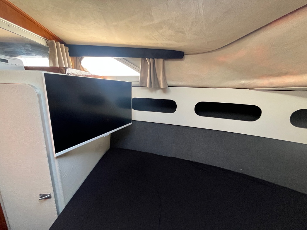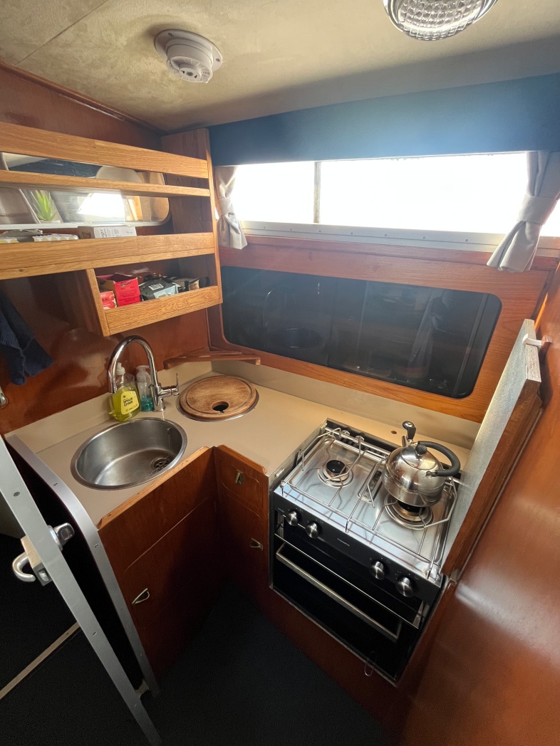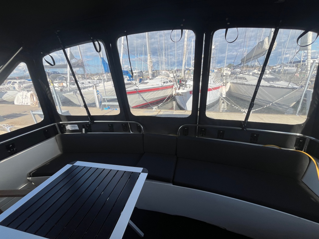 Fra agterdækket træder du ind i dejlig salon med styreplads og sofaer. Et dejlig lysfald skabes fra skydedøren (ud til agterdækket) og fra de store vinduespartier. Nedgang midtskib til pantryområde i STB-side og modsat i BB-side "slyngelstuen" med bord og gode bløde siddepladser. Her kan spises en dejlig middag og fortælles røverhistorier. Forrest i skibet fast sovekabine med god bred dobbeltseng. Yderligere forefindes badeværelse med toilet/brus ombord.